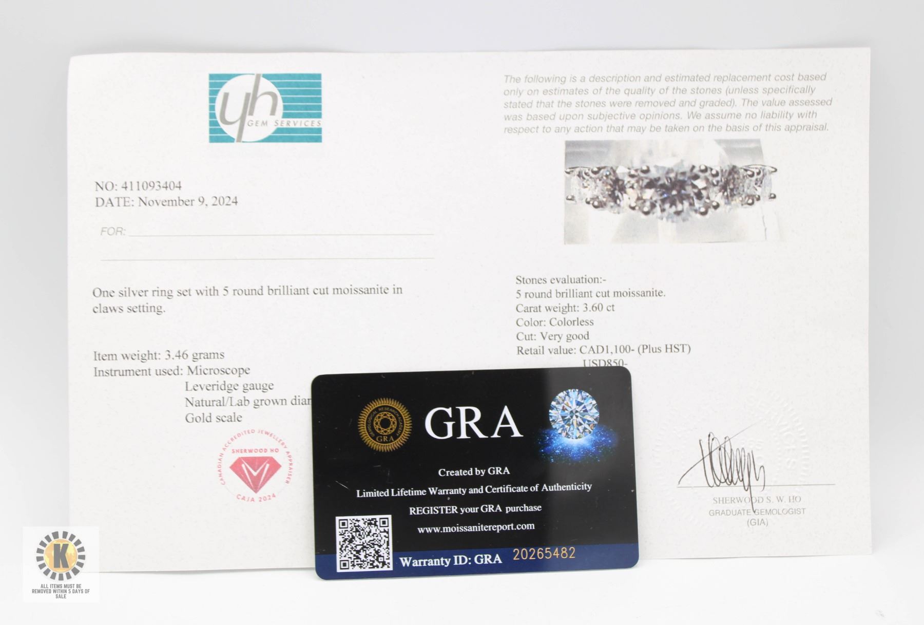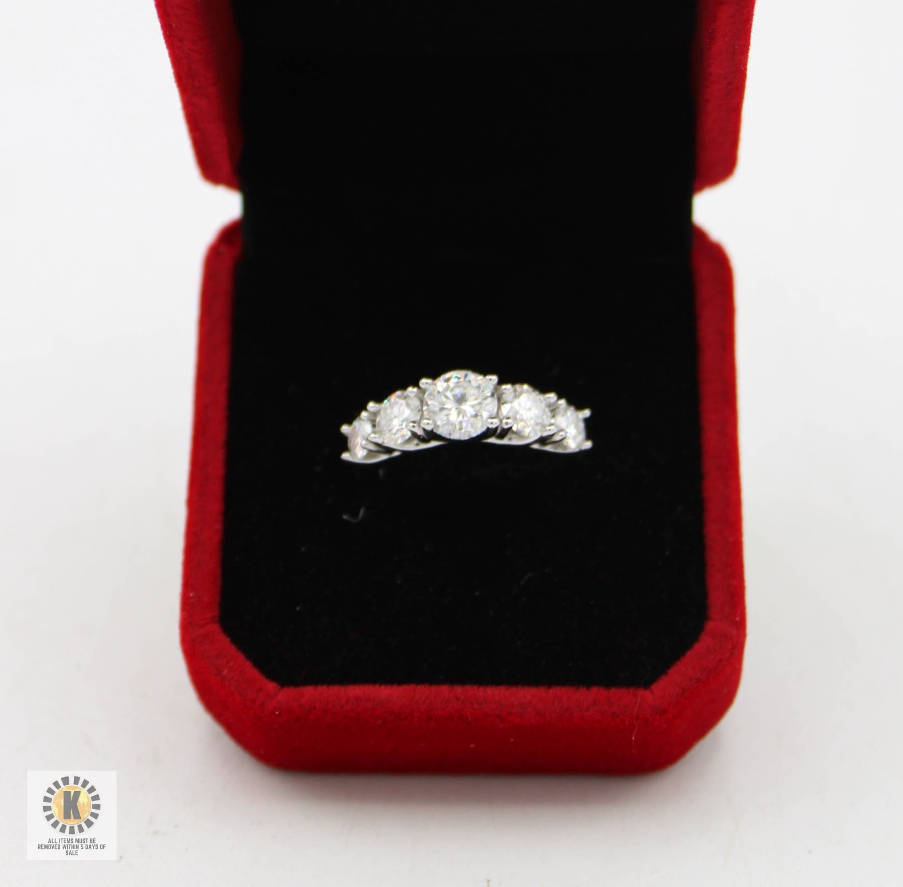 BRILLIANT CUT MOISSANITE STONES VVS D COLOR SET WITH 5 GRADUATING SIZES FROM THE LARGER CENTER SET IN 925 SILVER RING SIZE 6.25 RETAIL VALUE $1,100.00 **ALL ITEMS MUST BE REMOVED BY 5PM SATURDAY, MARCH 15TH 2025. ALL REMAINING ITEMS WILL BE SUBJECT TO A $6.00 PER DAY STORAGE CHARGE. ANY ITEMS REMAINING AFTER MONDAY, MARCH 31ST 2025 WILL BE CONSIDERED FORFEITED. NO REFUNDS WILL BE ISSUED FOR FORFEITED ITEMS. TO SCHEDULE A PICK UP APPOINTMENT CLICK HERE