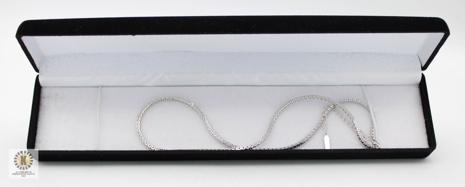 MOISSANITE STONES VVS D COLOR SET IN 465 MM LONG TENNIS NECKLACE WITH 5 MM EXTENSION SET IN 925 SILVER **ALL ITEMS MUST BE REMOVED BY 5PM SATURDAY, MARCH 15TH 2025. ALL REMAINING ITEMS WILL BE SUBJECT TO A $6.00 PER DAY STORAGE CHARGE. ANY ITEMS REMAINING AFTER MONDAY, MARCH 31ST 2025 WILL BE CONSIDERED FORFEITED. NO REFUNDS WILL BE ISSUED FOR FORFEITED ITEMS. TO SCHEDULE A PICK UP APPOINTMENT CLICK HERE