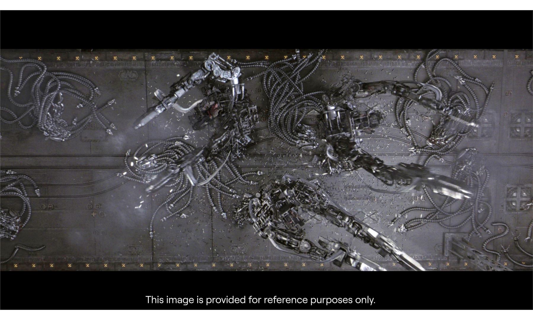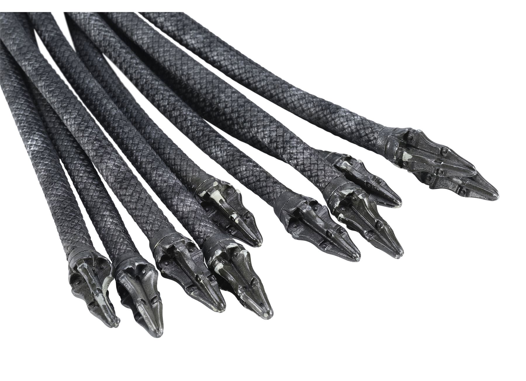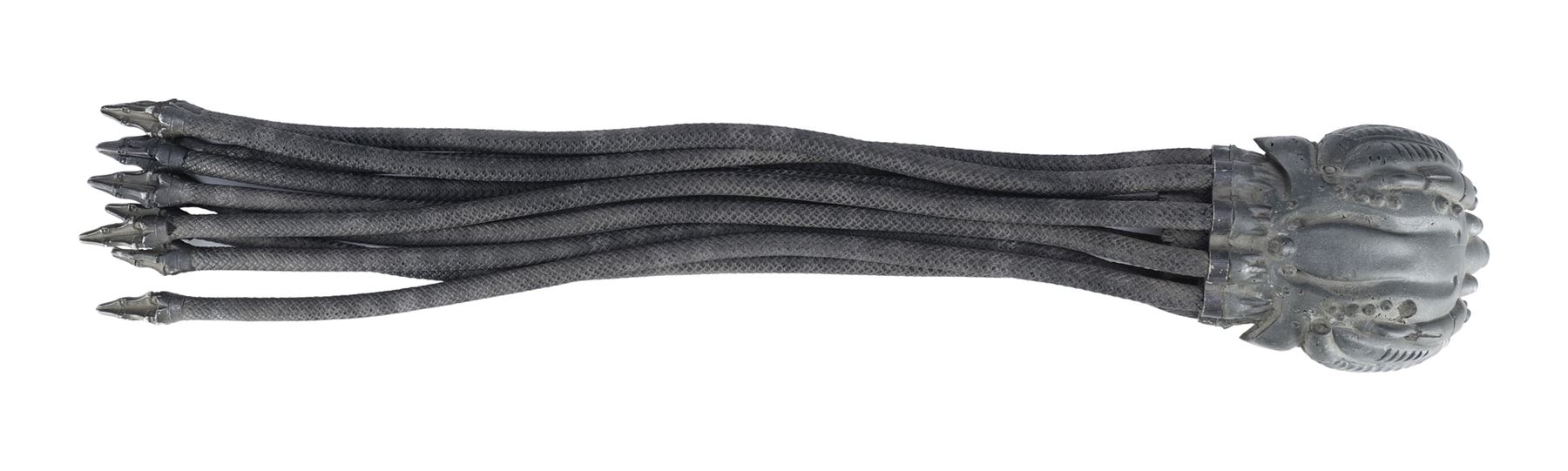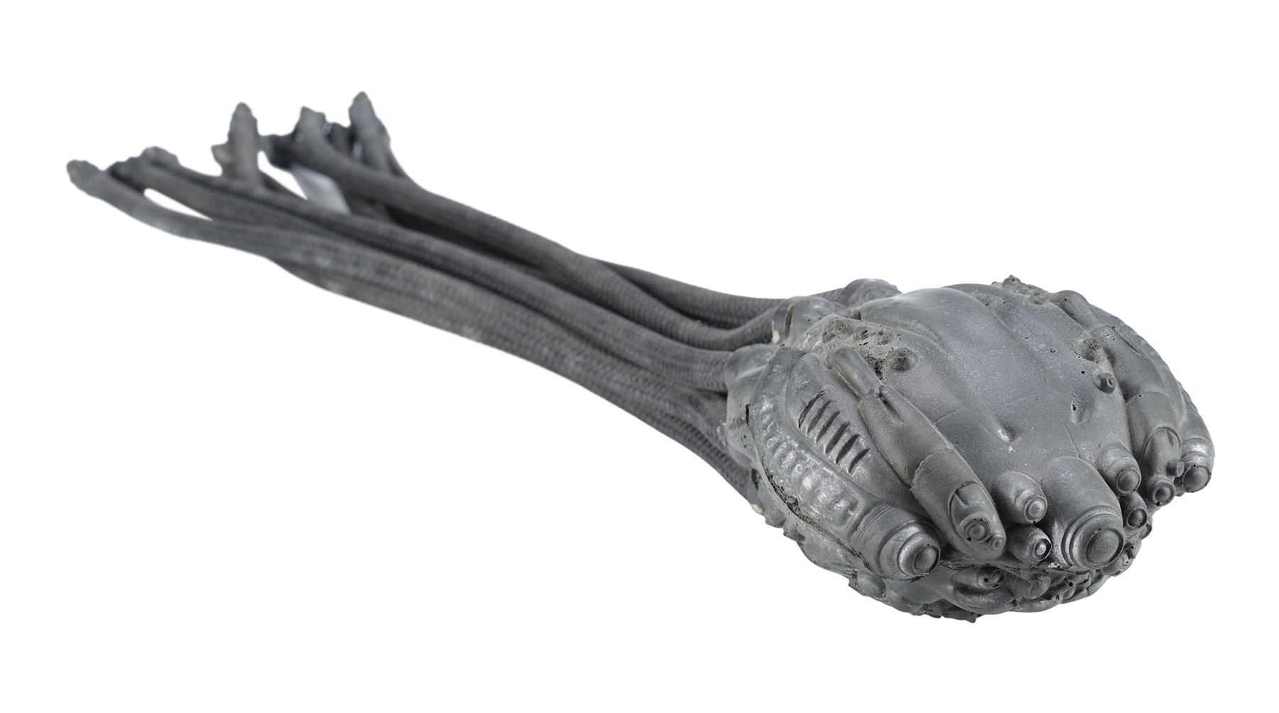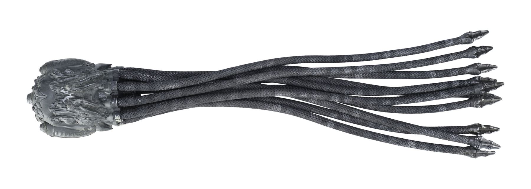 All-black sentinel models of this style were created for VFX inserts shot on the large Zion model set staged on Alameda Island. Constructed from multiple materials including foam, resin, and woven cord, it features a large central body with cast details and 10 tentacle-like appendages attached. The miniature exhibits some untrimmed flash, small holes and cracks, and some grime. Dimensions: 25.5" x 5" x 3.5" (65 cm x 12.75 cm x 9 cm)