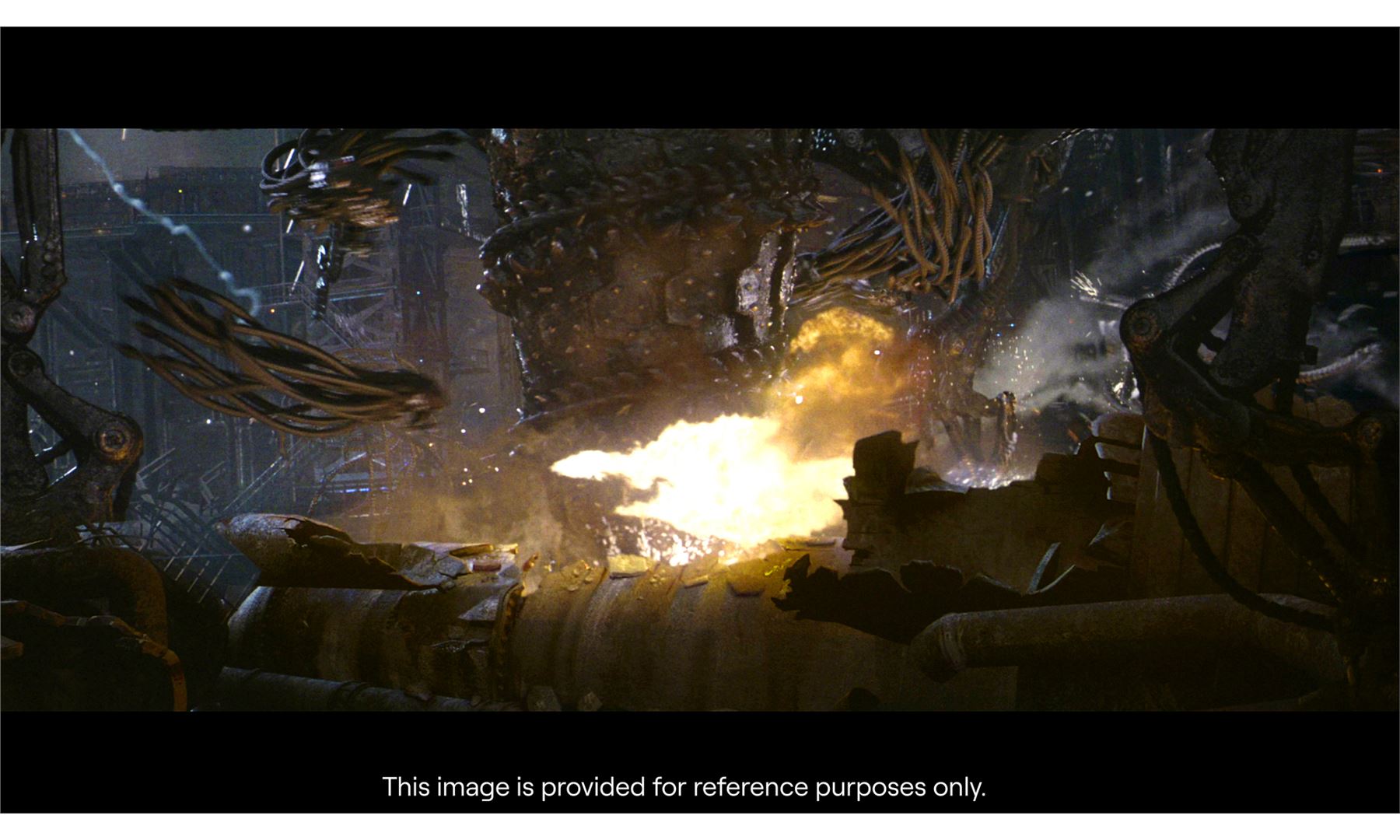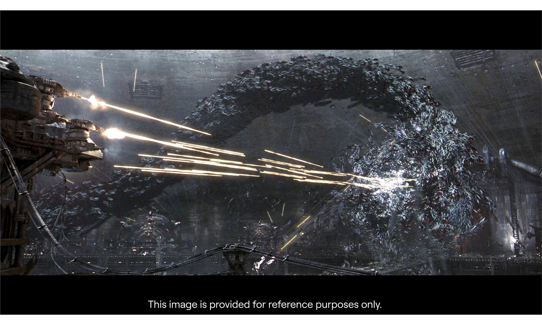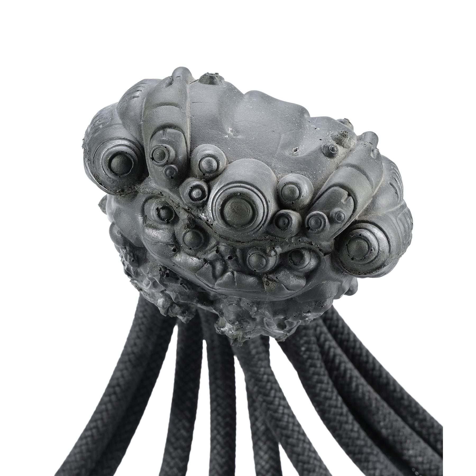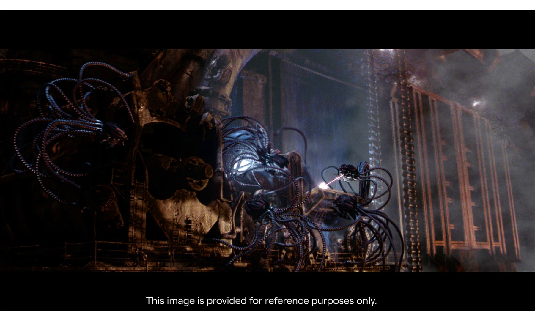 All-black sentinel models of this style were created for VFX inserts shot on the large Zion model set staged on Alameda Island. Constructed from multiple materials including foam, resin, and woven cord, it features a large central body with cast details and 10 tentacle-like appendages attached. The miniature exhibits some untrimmed flash, small holes and cracks, and some grime. Dimensions: 25.5" x 5" x 3.5" (65 cm x 12.75 cm x 9 cm)