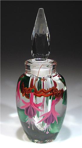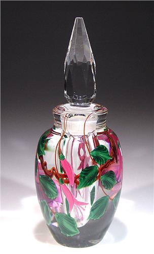 Steven Lundberg Glass Art "Fuchsia" compound scent bottle, with pink and purple fuchsia blossoms, pink buds, dark green leaves, and vines. Multi-faceted clear stopper. Signed/dated 1998 by Steven Lundberg. Gold sticker underneith. Height 7". NO RESERVE