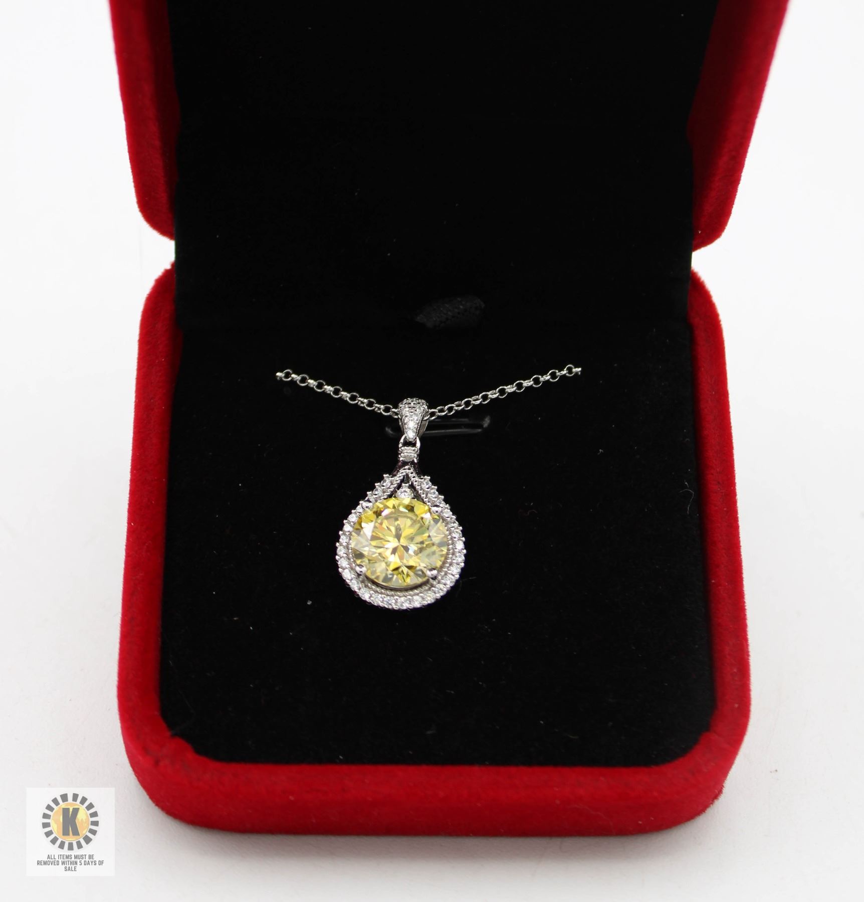 BRILLIANT CUT MOISSANITE STONE VVS LEMON YELLOW COLOR WITH 43 ROUND BRILLIANT CUT CUBIC ZIRCONIA SET IN 925 SILVER PENDANT AND BALE SET IN 925 SILVER PENDANT **ALL ITEMS MUST BE REMOVED BY 5PM SATURDAY, MARCH 15TH 2025. ALL REMAINING ITEMS WILL BE SUBJECT TO A $6.00 PER DAY STORAGE CHARGE. ANY ITEMS REMAINING AFTER MONDAY, MARCH 31ST 2025 WILL BE CONSIDERED FORFEITED. NO REFUNDS WILL BE ISSUED FOR FORFEITED ITEMS. TO SCHEDULE A PICK UP APPOINTMENT CLICK HERE