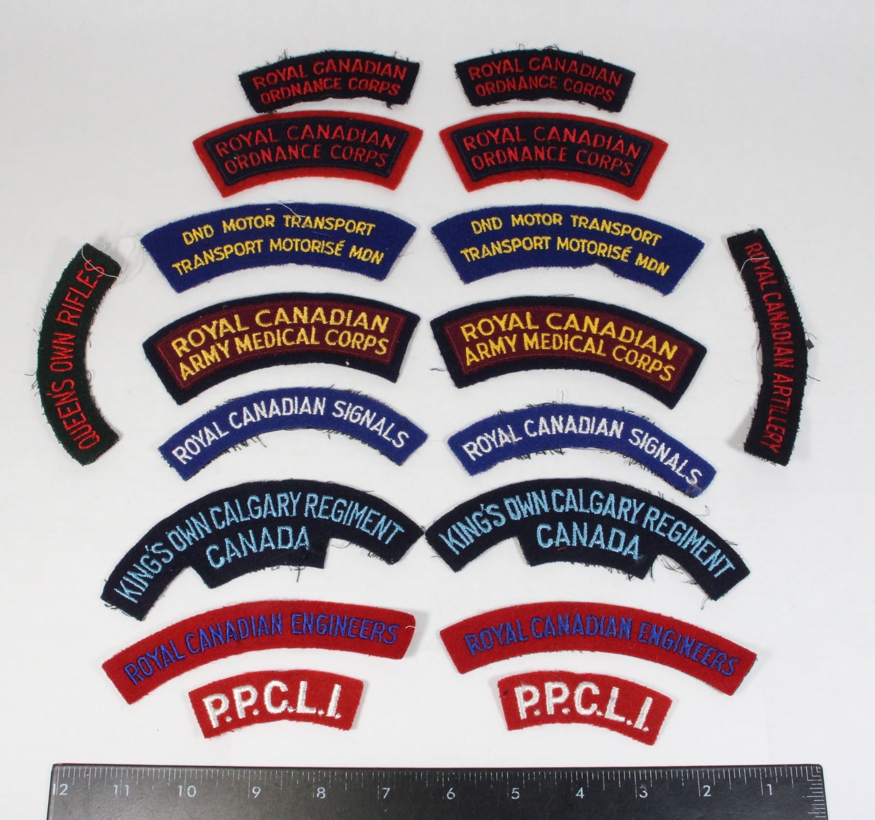 PRINCESS PATRICIA'S CANADIAN LIGHT INFANTRY PAIR/SET, ROYAL CANADIAN ORDNANCE CORPS AND ASSORTED SETS FOR WEAR ON BATTLEDRESS/UNIFORM CANADA ALLIED FORCES