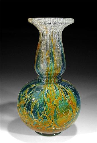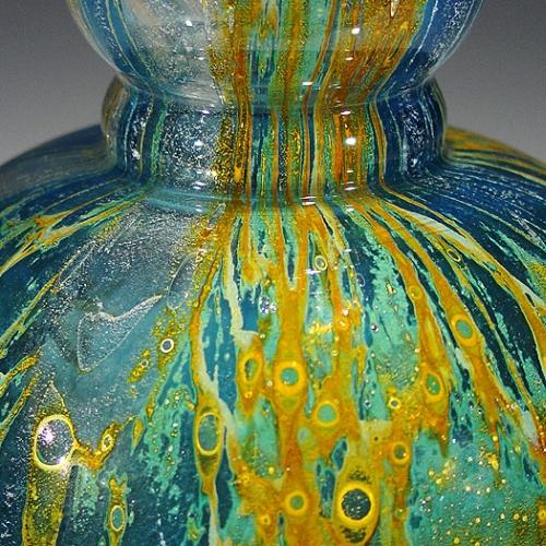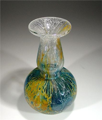 Miscellaneous large glass vase, with a bulbous base, a long thick neck, and wide-rimmed mouth. The base is translucent teal-blue, which fades to clear at the top of the piece, and the entire vase is streaked and splattered with amber and silver-white. Height 8 3/4", diameter 5 1/2". NO RESERVE