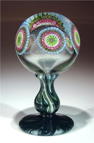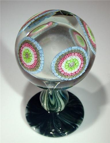 Miscellaneous magnum millefiori pedestal paperweight, with a clear-encased large silver bubble, which is surrounded by four spaced circles of concentric canes, each in alternating blue, yellow, pink, white, and green. The large orb rests atop a marbled, dark green and white, footed base. Rough pontil. Height 8 1/2", diameter 4 3/8". NO RESERVE