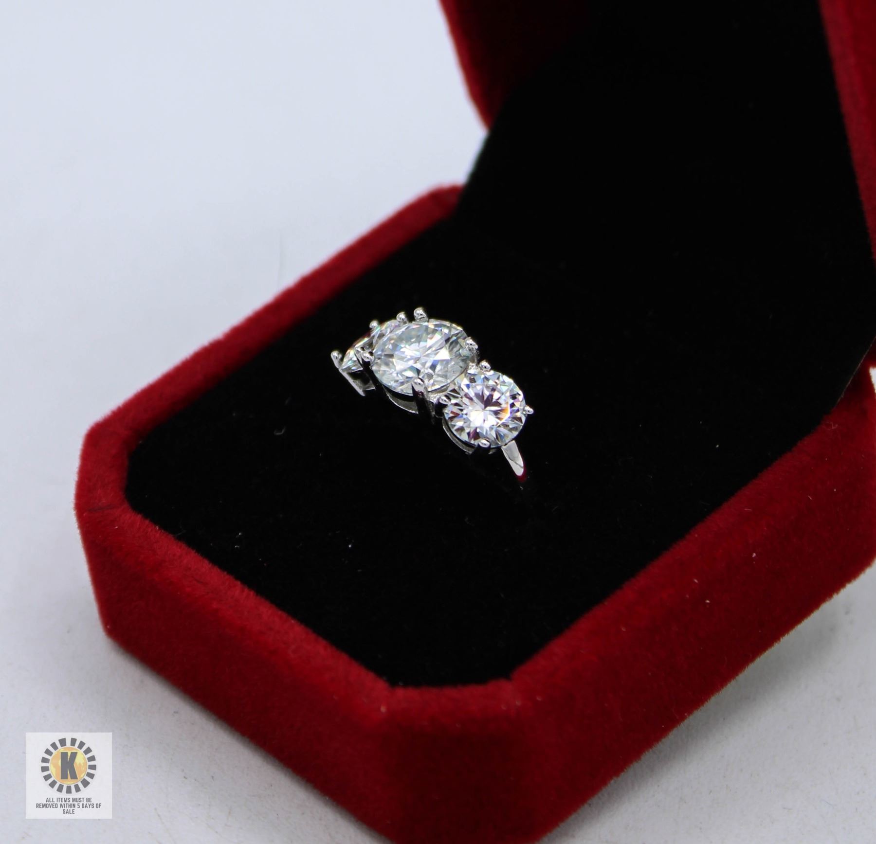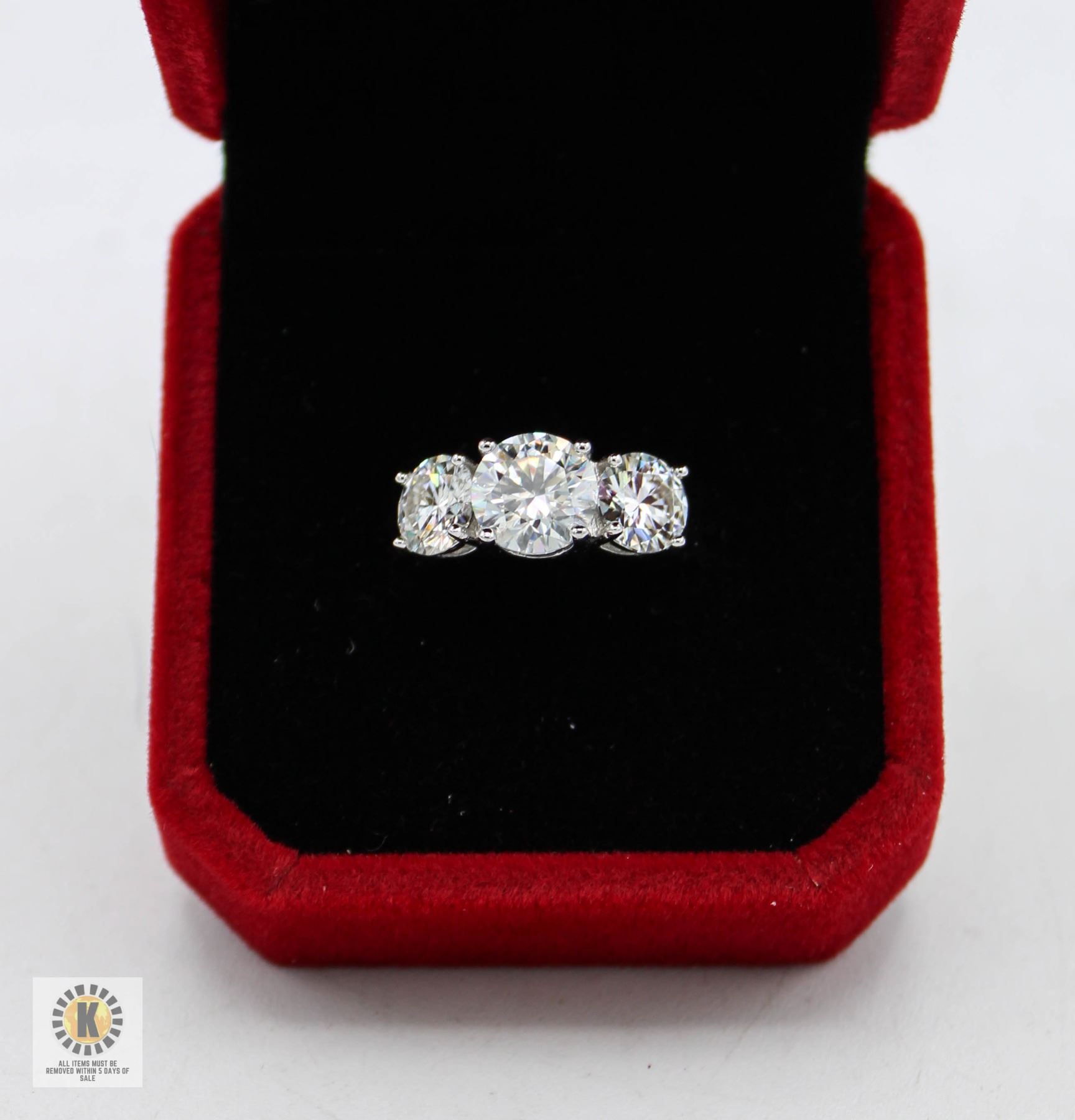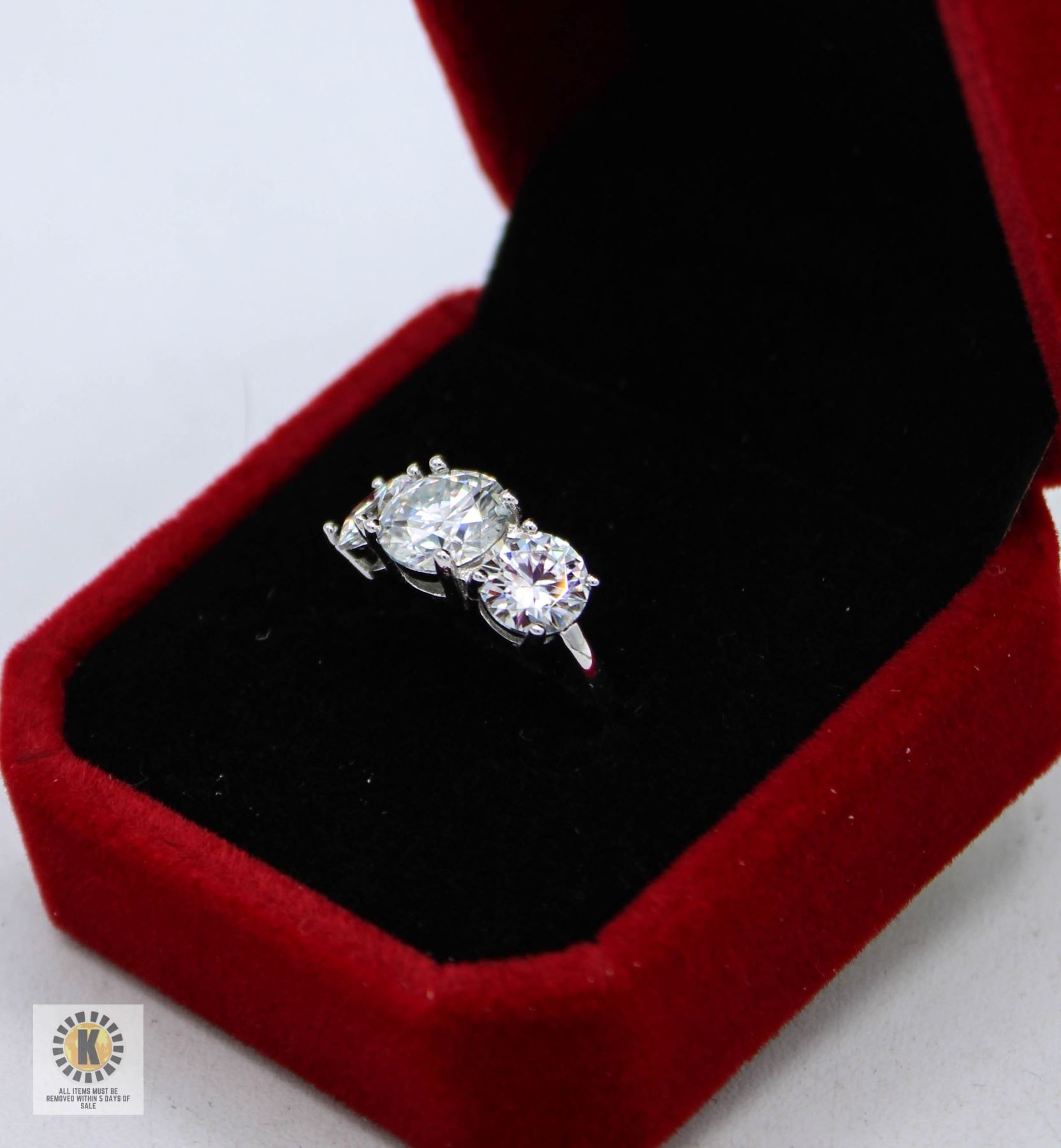 BRILLIANT CUT MOISSANITE STONES VVS D COLOR SET WITH 2.00 CT SET IN CENTER WITH 1.00 CT SET ON EITHER SIDE SET IN 925 SILVER RING SIZE 6.50 RETAIL VALUE $1,100.00 **ALL ITEMS MUST BE REMOVED BY 5PM SATURDAY, MARCH 22ND 2025. ALL REMAINING ITEMS WILL BE SUBJECT TO A $6.00 PER DAY STORAGE CHARGE. ANY ITEMS REMAINING AFTER MONDAY, APRIL 7TH 2025 WILL BE CONSIDERED FORFEITED. NO REFUNDS WILL BE ISSUED FOR FORFEITED ITEMS. TO SCHEDULE A PICK UP APPOINTMENT CLICK HERE