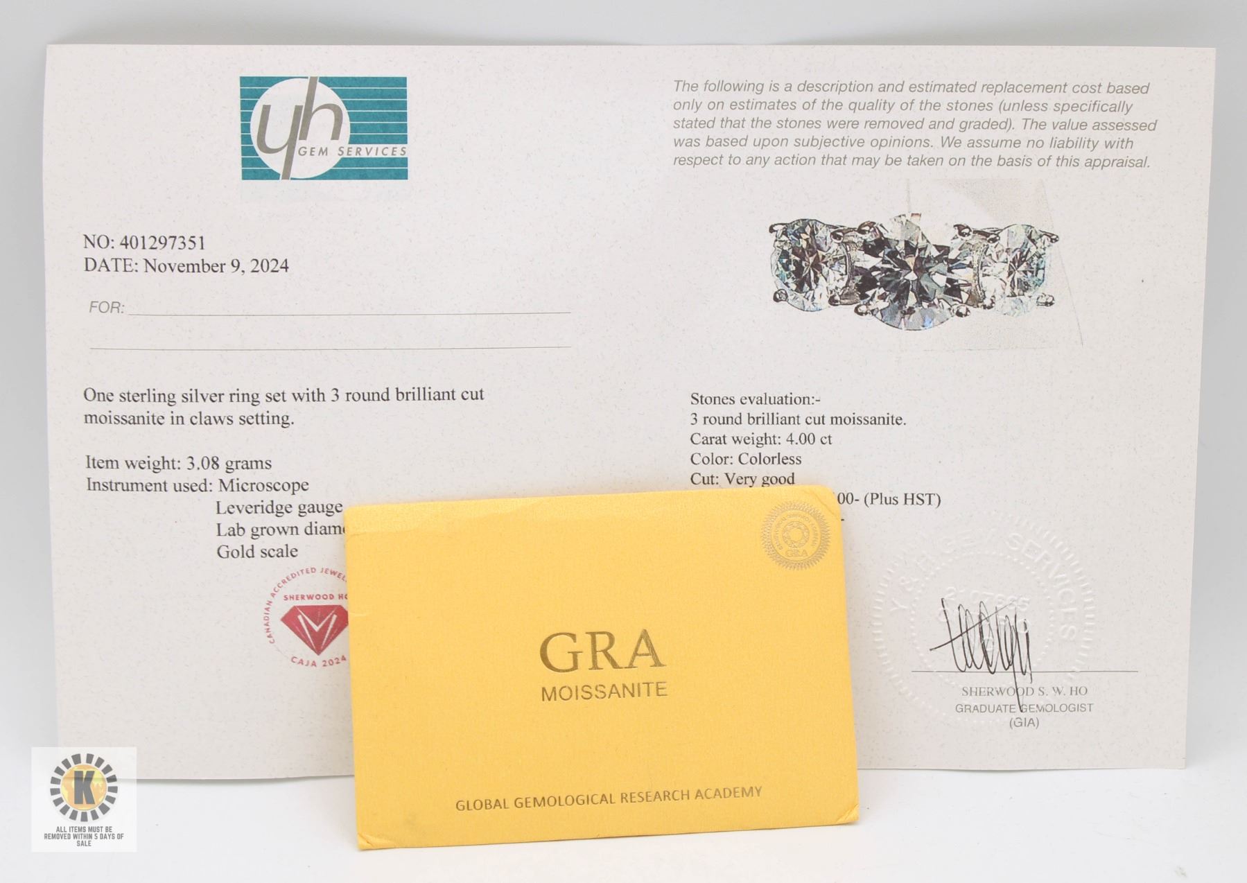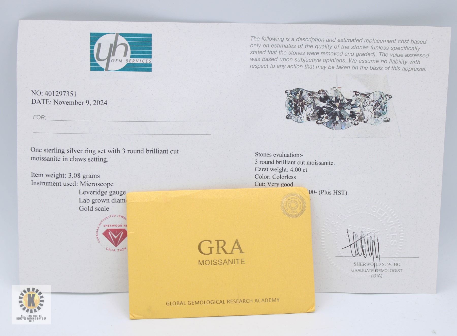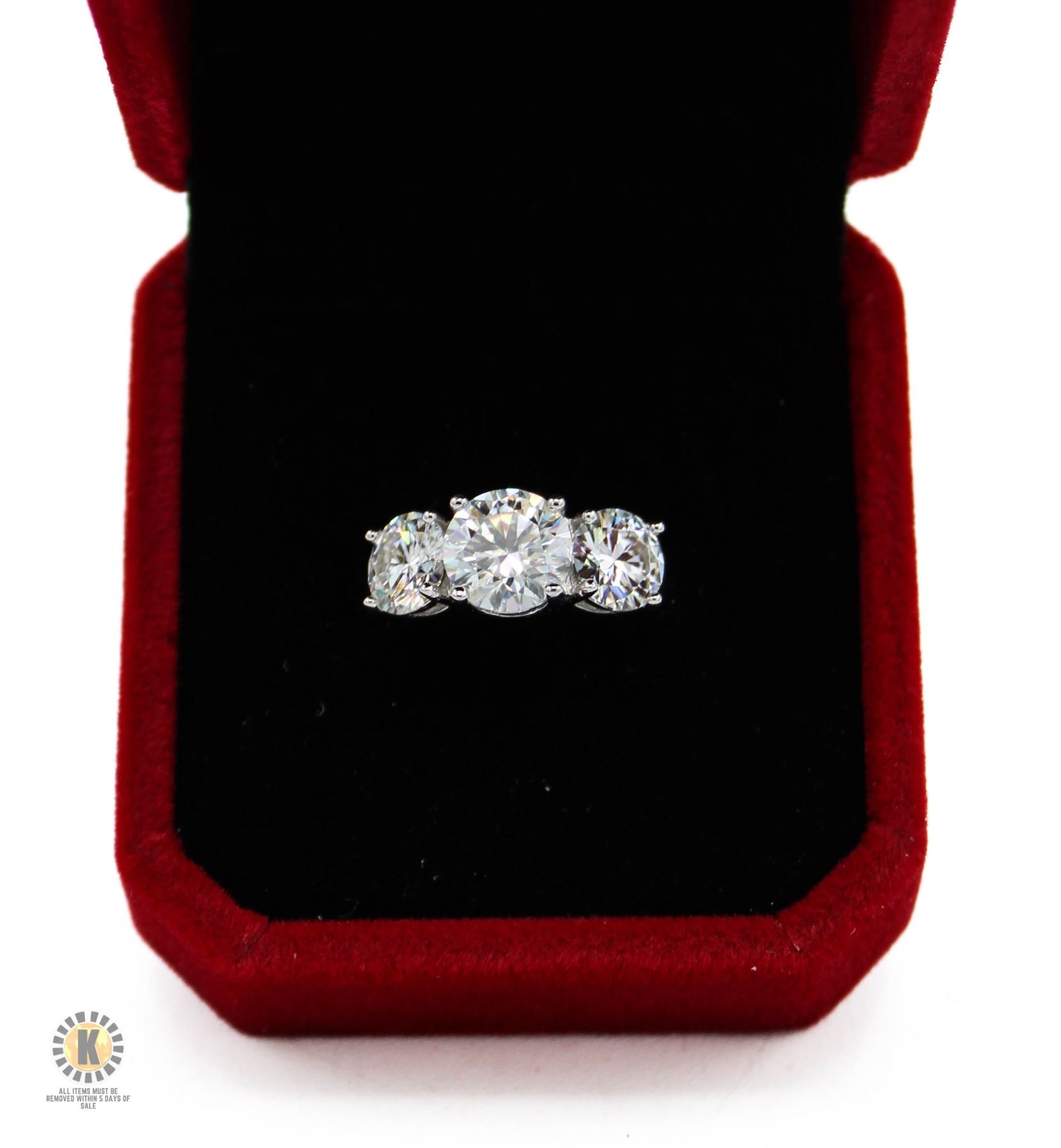 BRILLIANT CUT MOISSANITE STONES VVS D COLOR SET WITH 2.00 CT SET IN CENTER WITH 1.00 CT SET ON EITHER SIDE SET IN 925 SILVER RING SIZE 6.50 RETAIL VALUE $1,100.00 **ALL ITEMS MUST BE REMOVED BY 5PM SATURDAY, MARCH 22ND 2025. ALL REMAINING ITEMS WILL BE SUBJECT TO A $6.00 PER DAY STORAGE CHARGE. ANY ITEMS REMAINING AFTER MONDAY, APRIL 7TH 2025 WILL BE CONSIDERED FORFEITED. NO REFUNDS WILL BE ISSUED FOR FORFEITED ITEMS. TO SCHEDULE A PICK UP APPOINTMENT CLICK HERE