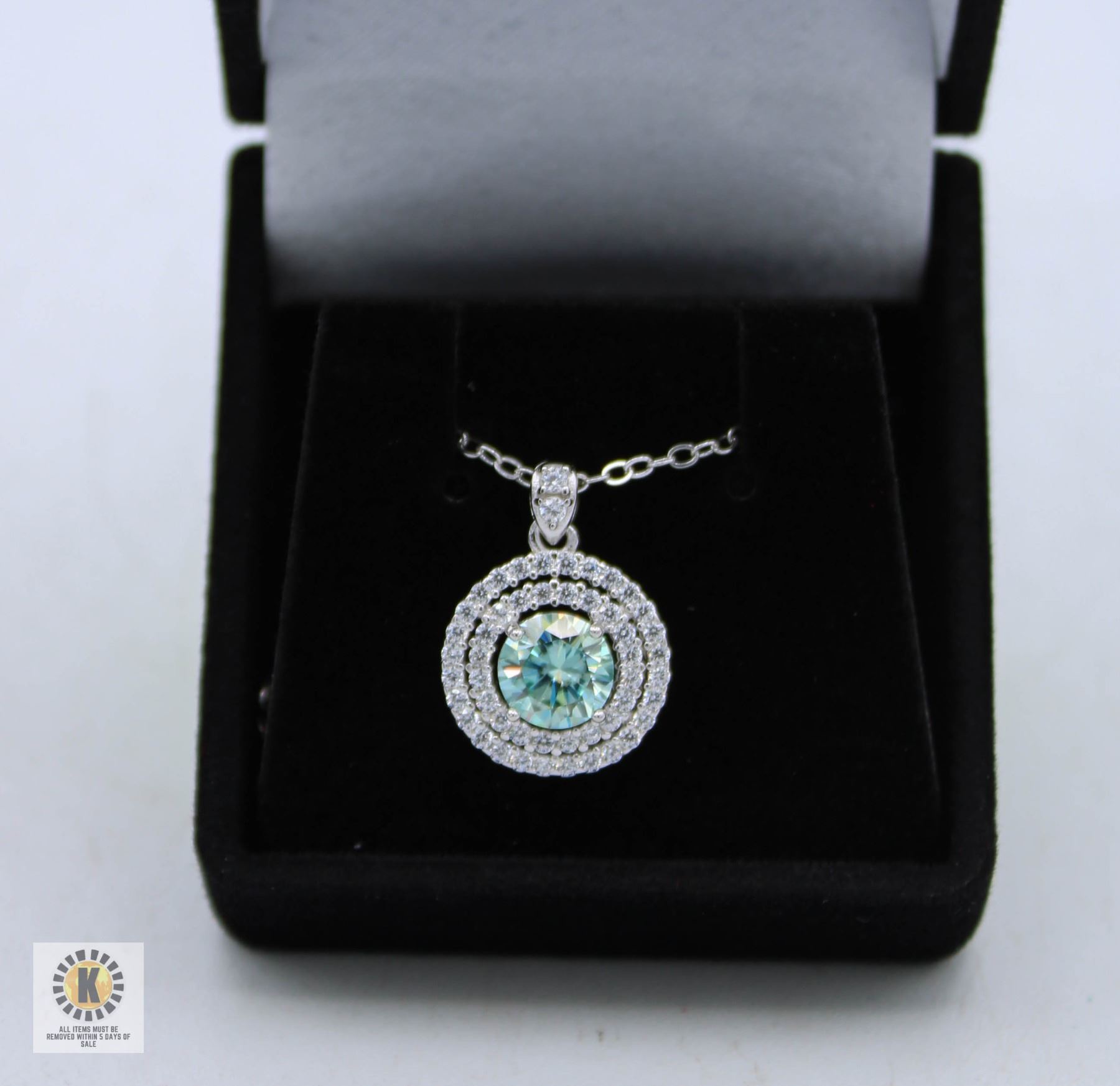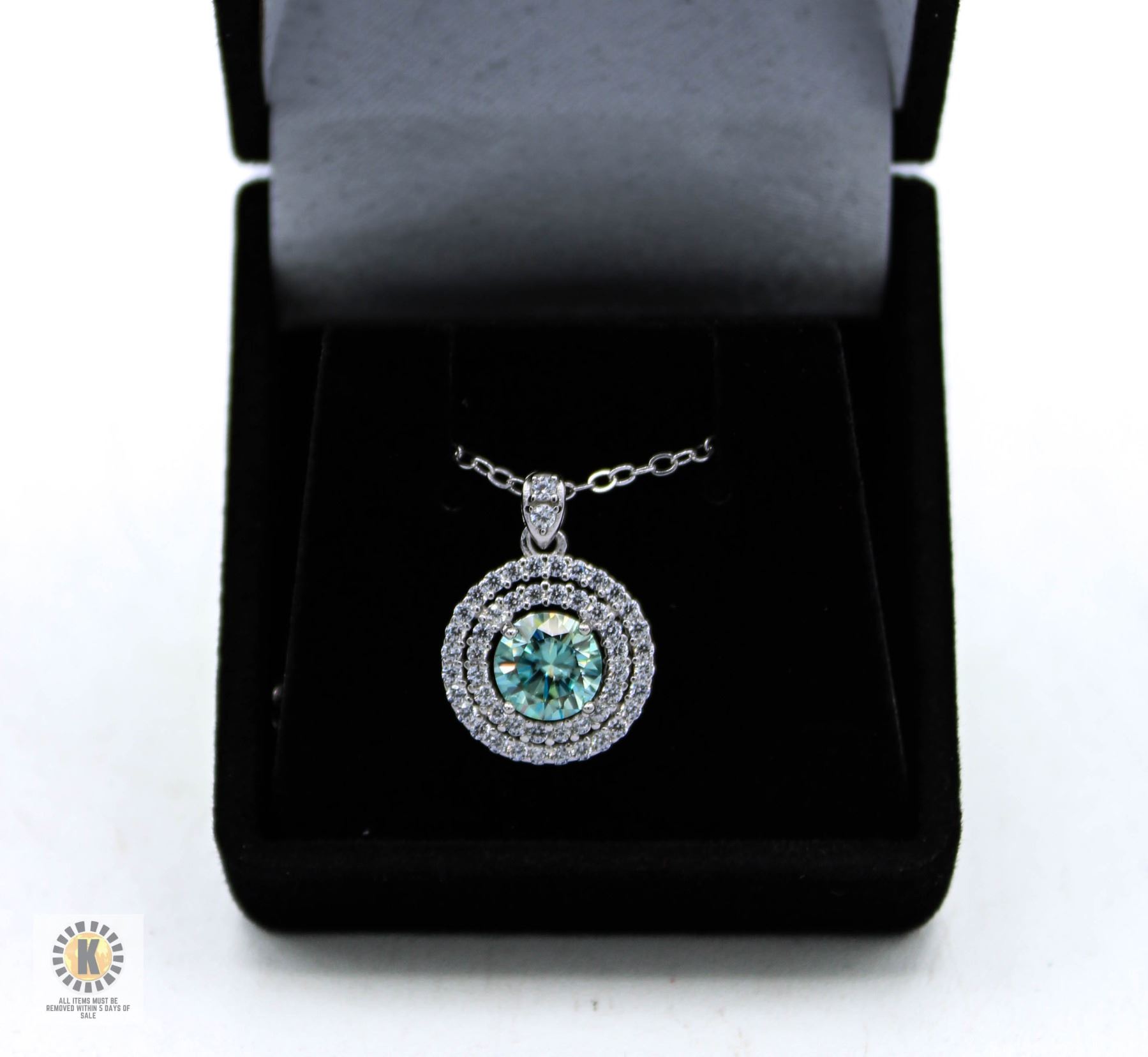 CUT MOISSANITE STONE VVS FANCY BLUE COLOR WITH 50 ROUND BRILLIANT CUT CUBIC ZIRCONIA SET DUAL HALOS AROUND CENTER WITH SOME IN BALE SET IN 925 SILVER PENDANT RETAIL VALUE $875.00 **ALL ITEMS MUST BE REMOVED BY 5PM SATURDAY, MARCH 22ND 2025. ALL REMAINING ITEMS WILL BE SUBJECT TO A $6.00 PER DAY STORAGE CHARGE. ANY ITEMS REMAINING AFTER MONDAY, APRIL 7TH 2025 WILL BE CONSIDERED FORFEITED. NO REFUNDS WILL BE ISSUED FOR FORFEITED ITEMS. TO SCHEDULE A PICK UP APPOINTMENT CLICK HERE