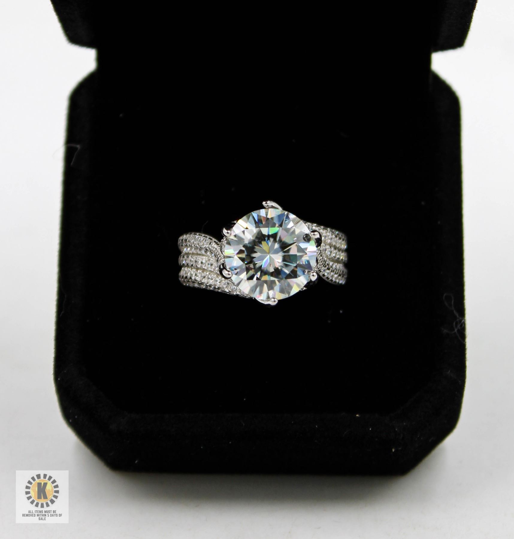 CUT MOISSANITE STONE VVS D COLOR SET WITH 130 ROUND BRILLIANT CUT CZ'S SET IN 925 SILVER RING SIZE 7 RETAIL VALUE $1,475.00 **ALL ITEMS MUST BE REMOVED BY 5PM SATURDAY, MARCH 29TH 2025. ALL REMAINING ITEMS WILL BE SUBJECT TO A $6.00 PER DAY STORAGE CHARGE. ANY ITEMS REMAINING AFTER MONDAY, APRIL 21ST 2025 WILL BE CONSIDERED FORFEITED. NO REFUNDS WILL BE ISSUED FOR FORFEITED ITEMS. TO SCHEDULE A PICK UP APPOINTMENT CLICK HERE