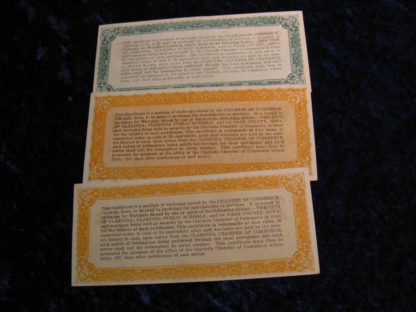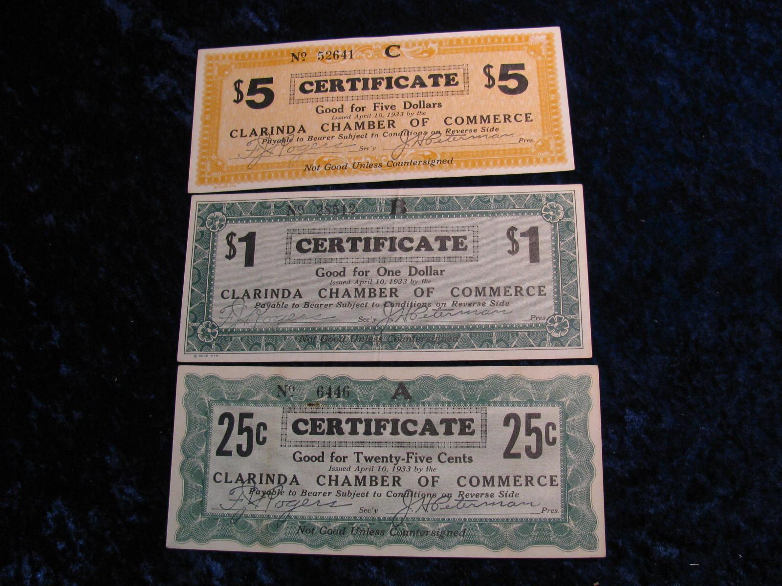2356. 1933 Clarinda Chamber of Commerce, .25c, $1 & $5. Clorinda, Iowa Depression Script.