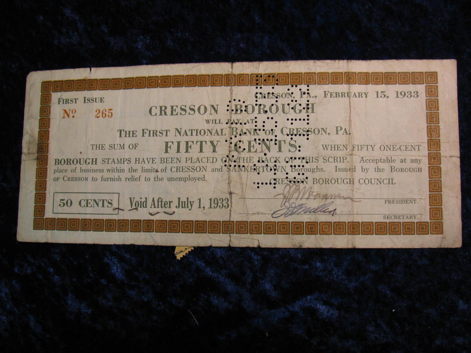 2361. 1933 Cresson Borough Pa. .50c Depression Script.