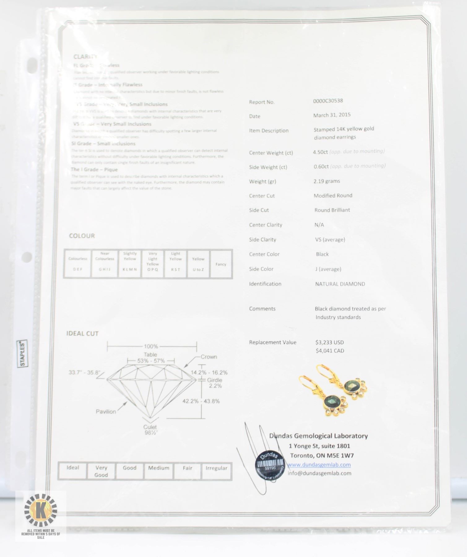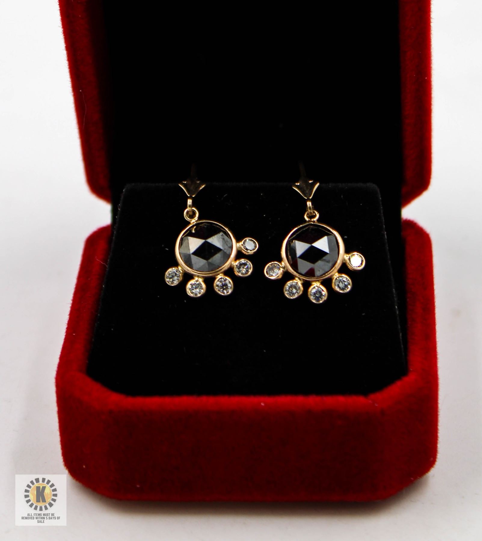 MODIFIED ROUND CUT WITH 5 BEZEL SET DIAMONDS SET BELOW EACH BLACK DIAMOND SET IN 14 KT YELLOW GOLD WITH THE 10 DIAMONDS WEIGHING A TOTAL 0.60 CT WITH THE EARRINGS WEIGHING 2.19 GRAMS **ALL ITEMS MUST BE REMOVED BY 5PM SATURDAY, MARCH 29TH 2025. ALL REMAINING ITEMS WILL BE SUBJECT TO A $6.00 PER DAY STORAGE CHARGE. ANY ITEMS REMAINING AFTER MONDAY, APRIL 21ST 2025 WILL BE CONSIDERED FORFEITED. NO REFUNDS WILL BE ISSUED FOR FORFEITED ITEMS. TO SCHEDULE A PICK UP APPOINTMENT CLICK HERE