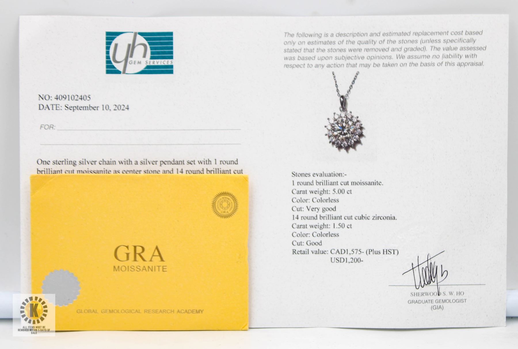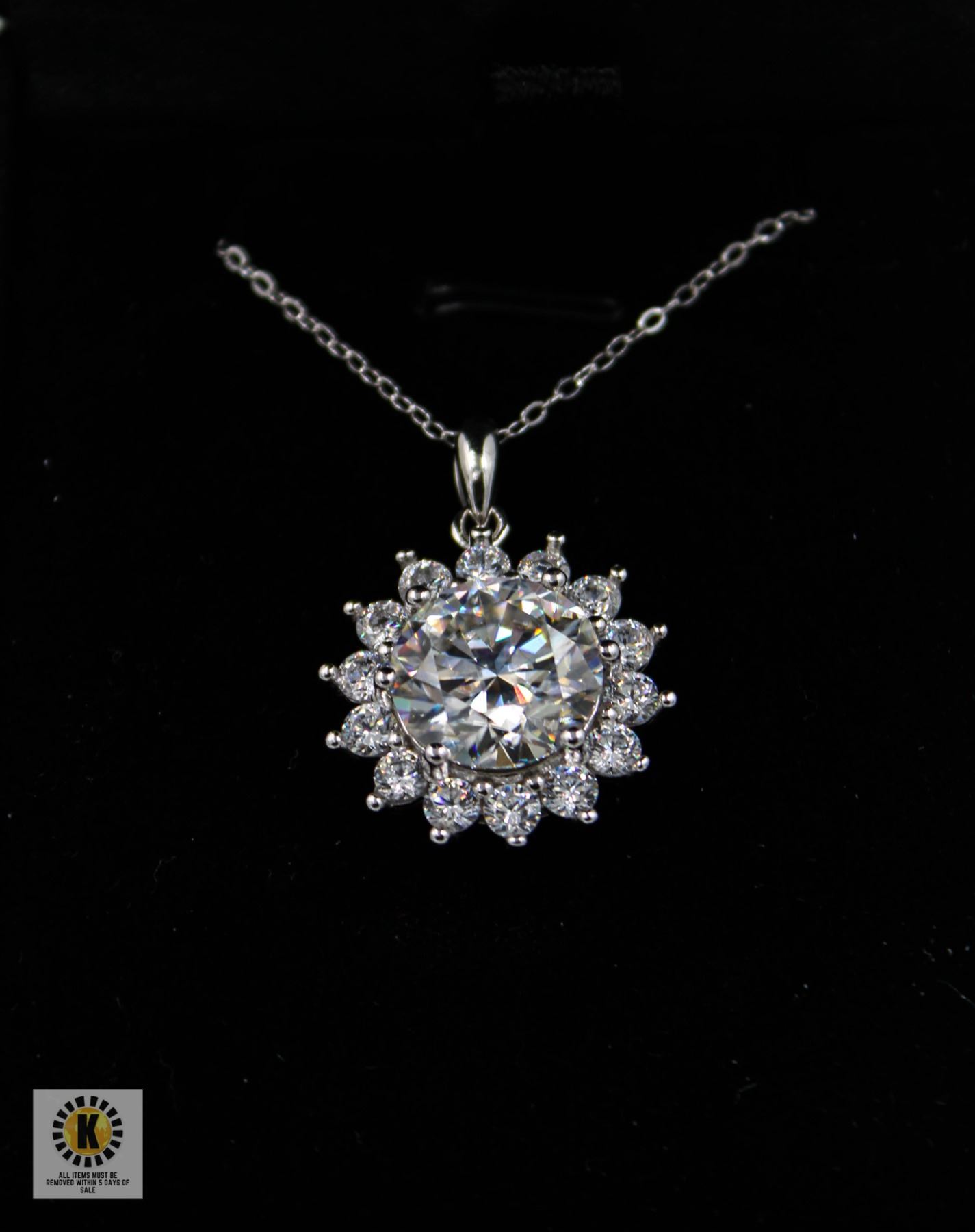 CUT MOISSANITE STONE VVS D COLOR WITH 14 ROUND BRILLIANT CUT CUBIC ZIRCONIA SET SURROUNDING THE CENTER MOISSANITE SET IN 925 SILVER PENDANT RETAIL VALUE $1,575.00 **ALL ITEMS MUST BE REMOVED BY 5PM SATURDAY, MARCH 29TH 2025. ALL REMAINING ITEMS WILL BE SUBJECT TO A $6.00 PER DAY STORAGE CHARGE. ANY ITEMS REMAINING AFTER MONDAY, APRIL 21ST 2025 WILL BE CONSIDERED FORFEITED. NO REFUNDS WILL BE ISSUED FOR FORFEITED ITEMS. TO SCHEDULE A PICK UP APPOINTMENT CLICK HERE