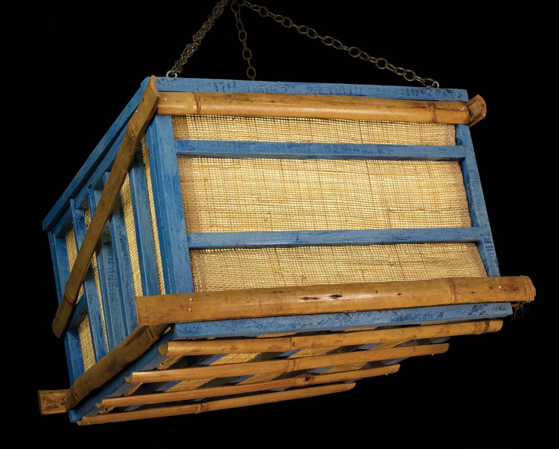 (1970s) A pure product of LeRoy Schmaltz's imagination, these "crate lamps" are made from scrap OA materials, lined with Tapa or matting and hung for decorative accent purposes. They were sold both electrified and without. These are without although internal lighting could easily be added. 21"x24"x15". VG+ with typical wear.