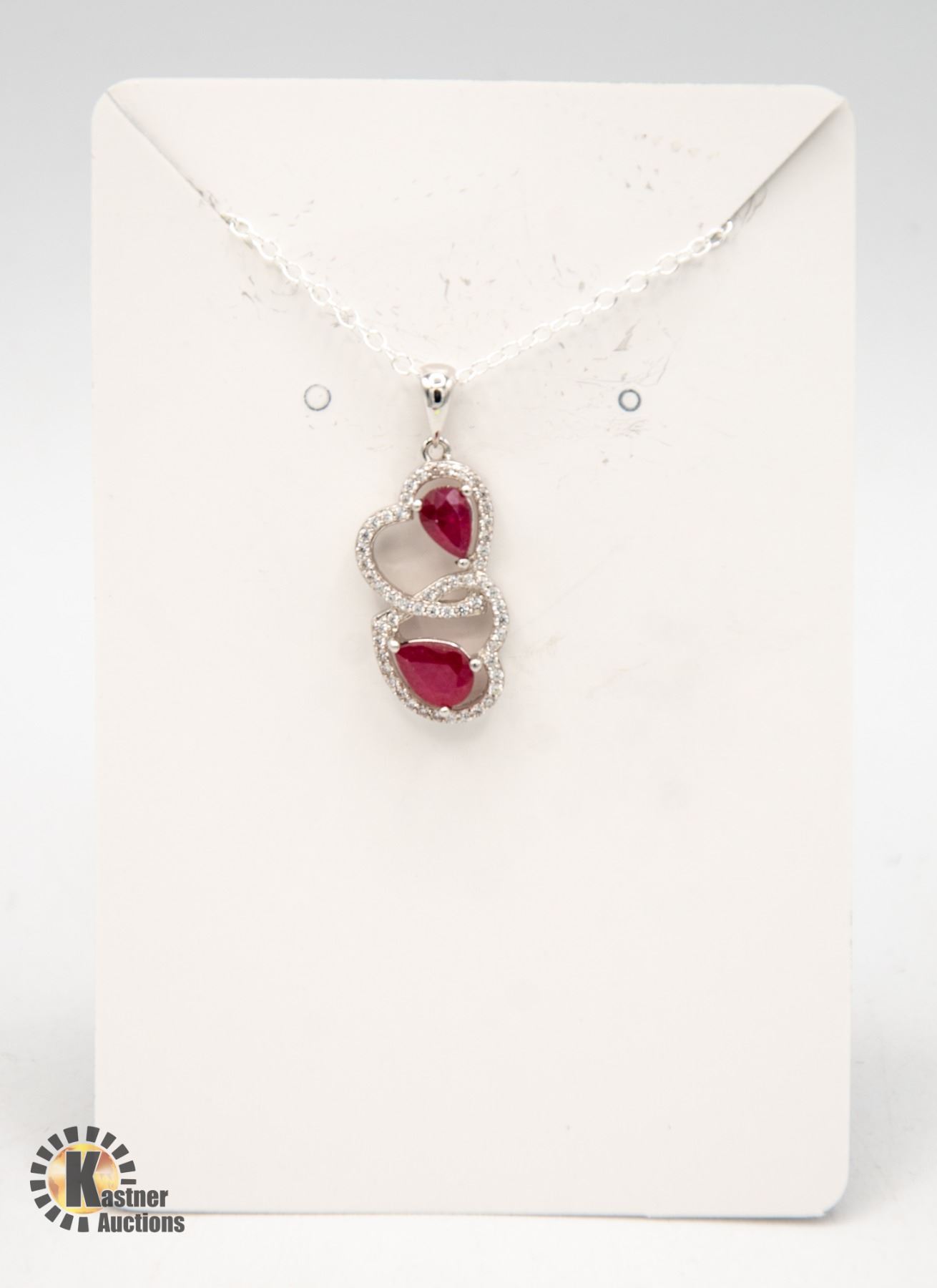 TREATED RUBY SET IN DUAL HEART SHAPED INTERLOCKING HALO CLEAR STONES ON 55 CM NECKLACE