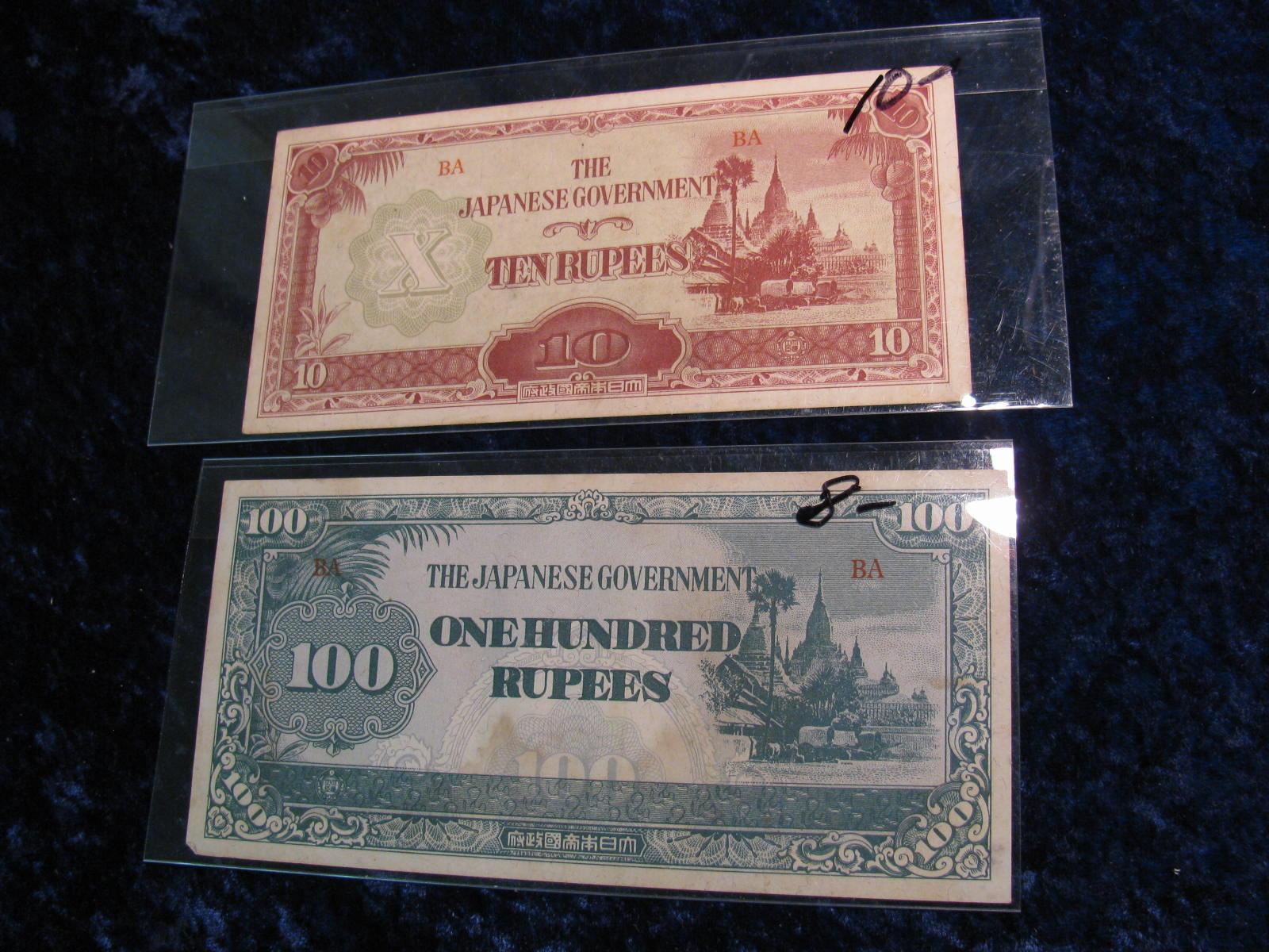 2372. WWII Japanese Government 10, 100 Rupee Notes.