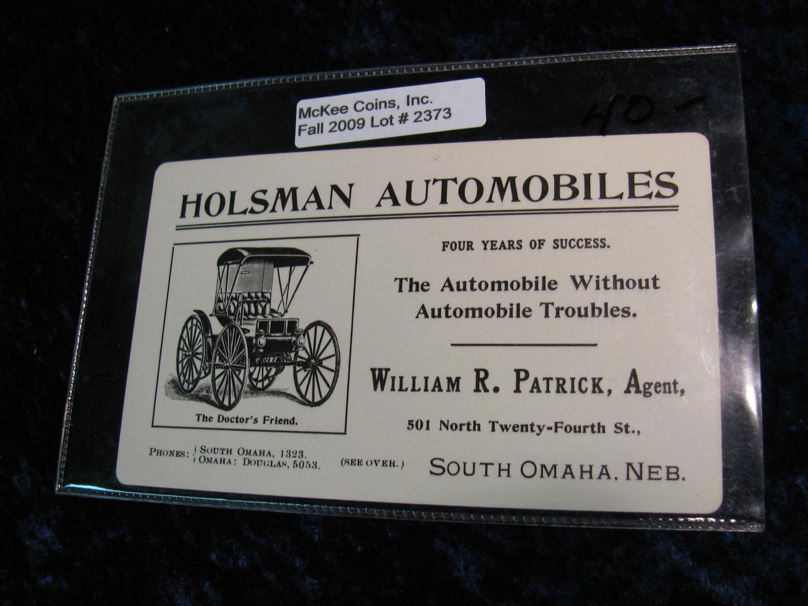 2373. Holsman Automobiles, South Omaha. Advertising Card.