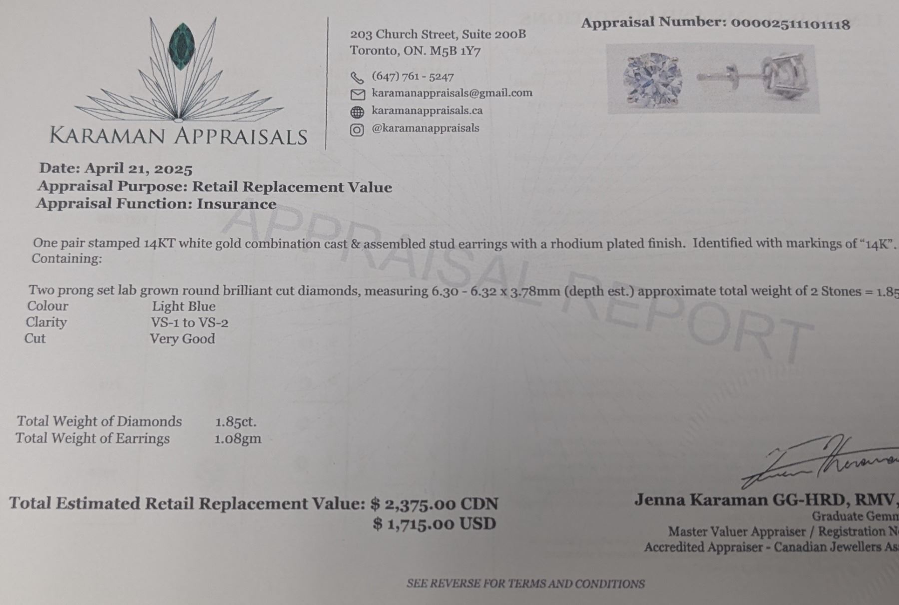 $2375, 14K(1.08g), LAB DIAMOND (1.85ct) EARRING, appraised/retail value $2375