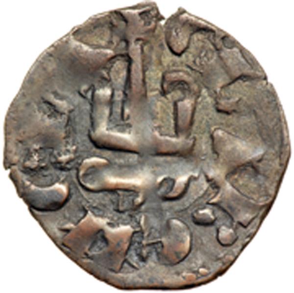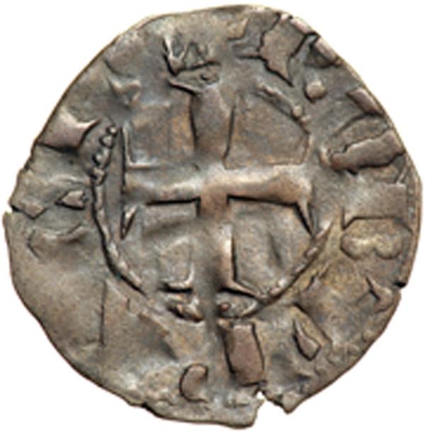 Italian States - Latin Principality of Achaia. Denier Tournois, Nd. Roberts-5317. 0.8 grams. Robert of Taranto, 1333-1364. Cross within inner circle. Leg: + ROBT P A. Reverse Castle Tournois. Leg: GLARENCTA. Very Fine.