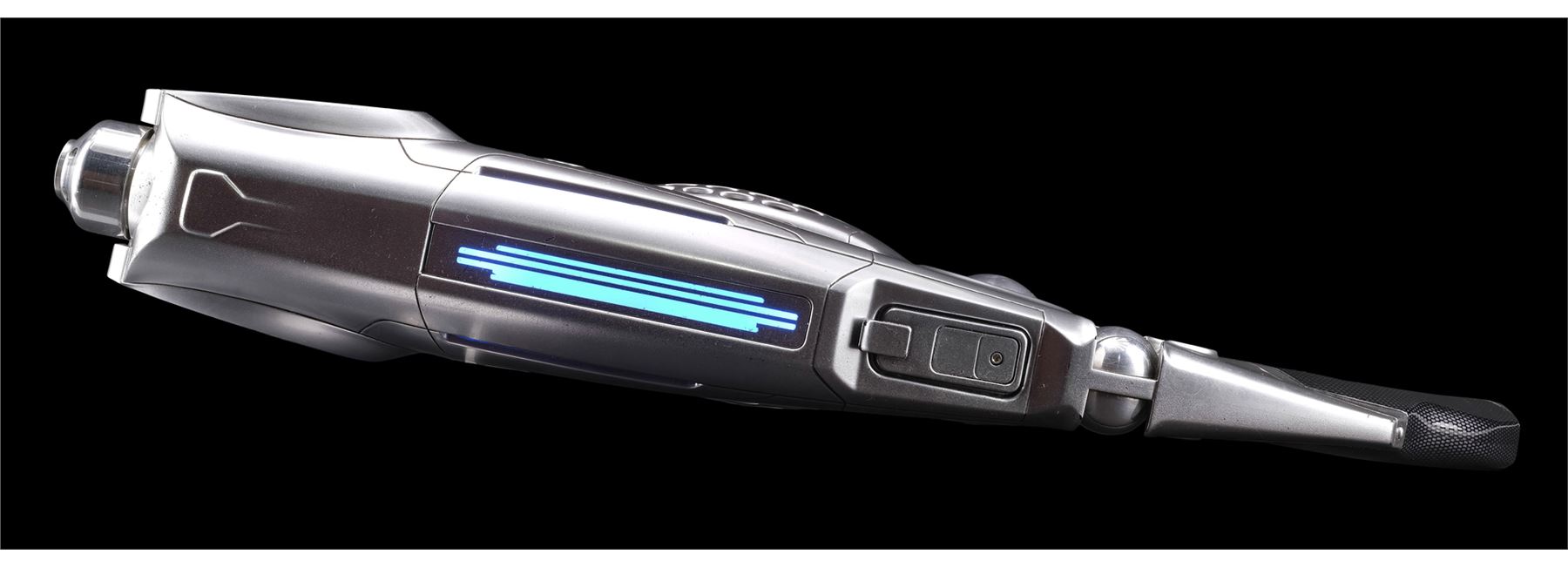This lot consists of a gray painted resin shotgun with an aluminum metal barrel, a black and gray "hydro-dipped" carbon fiber design on the underside and on the grip, and fog-coated acrylic pieces in various slots along the sides. This shotgun lights up by the small button above the grip. It illuminates the acrylic pieces in a blue light when powered. This lot exhibits tape residue under the grip, as well as minor scuffing and chipping paint to the resin components. Dimensions: 23" x 5" x 4" (58.5 cm x 12.75 cm x 10.25 cm)