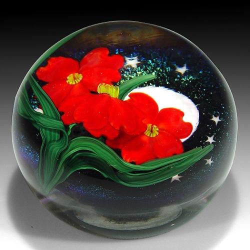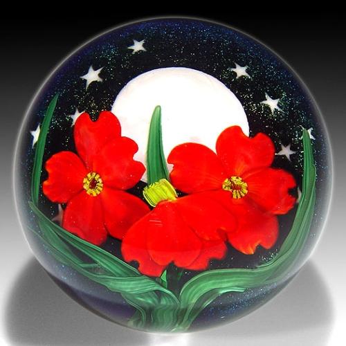 Steven Lundberg Glass Art 1999 "Poppy Moon" compound paperweight, with three red poppies and long dark green leaves, under a white full moon and scattered stars, in an iridescent dark blue night sky. Signed/dated by Justin Lundberg. Diameter 3 1/2". NO RESERVE