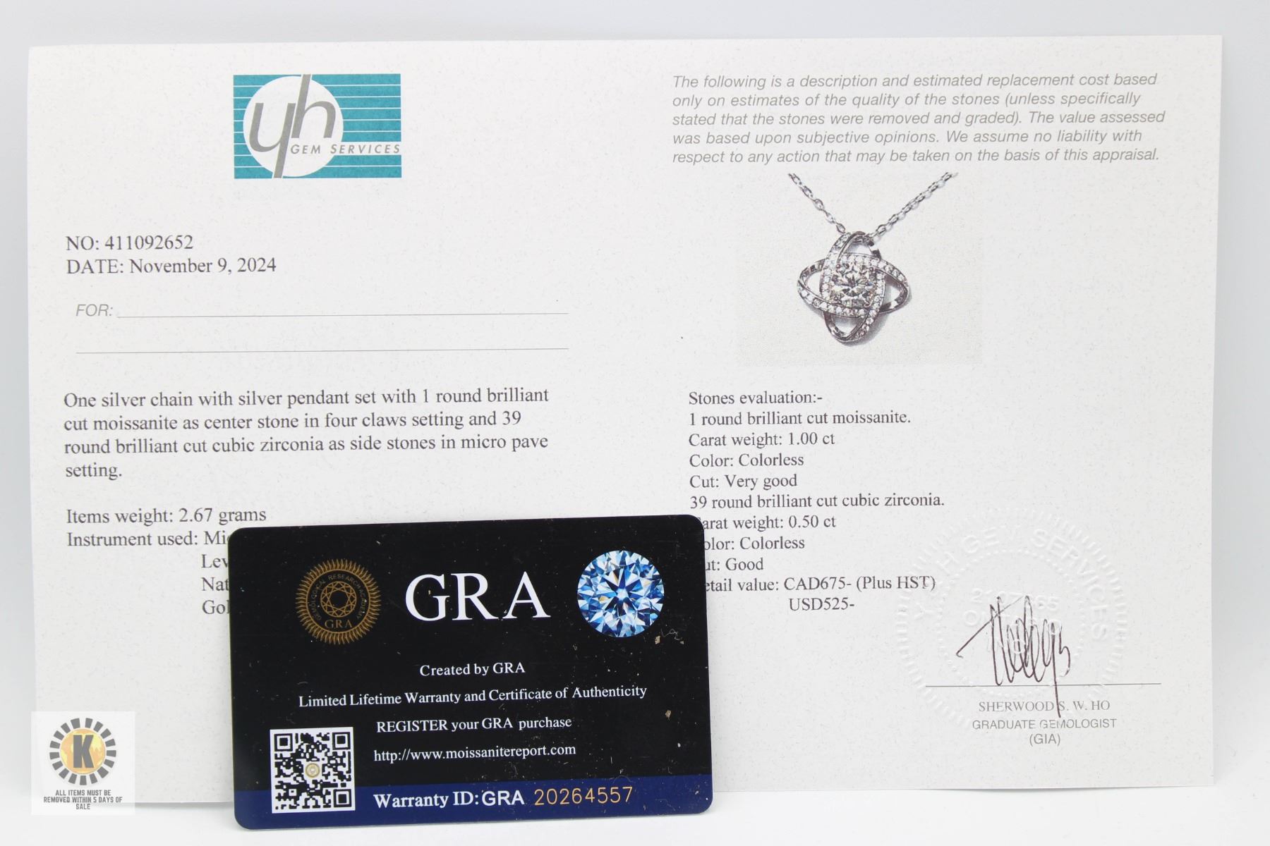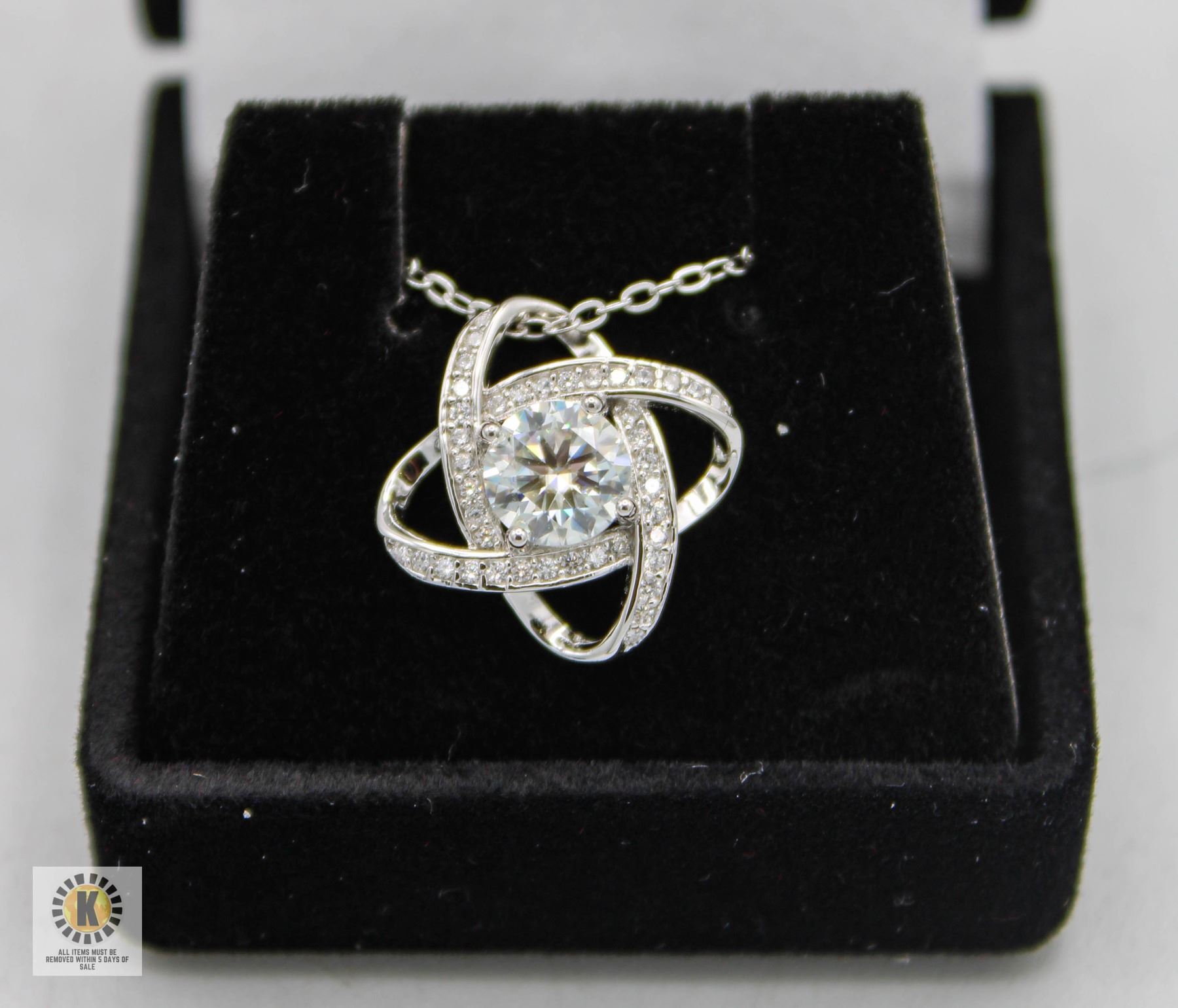 MOISSANITE STONE VVS D COLOR SET IN CENTER WITH 39 ROUND BRILLIANT CUT CUBIC ZIRCONIAS SET IN DUAL OVAL HALOS SET IN 925 SILVER PENDANT RETAIL VALUE $675.00 **ALL ITEMS MUST BE REMOVED BY 5PM SATURDAY, APRIL 5TH 2025. ALL REMAINING ITEMS WILL BE SUBJECT TO A $6.00 PER DAY STORAGE CHARGE. ANY ITEMS REMAINING AFTER MONDAY, APRIL 21ST 2025 WILL BE CONSIDERED FORFEITED. NO REFUNDS WILL BE ISSUED FOR FORFEITED ITEMS. TO SCHEDULE A PICK UP APPOINTMENT CLICK HERE