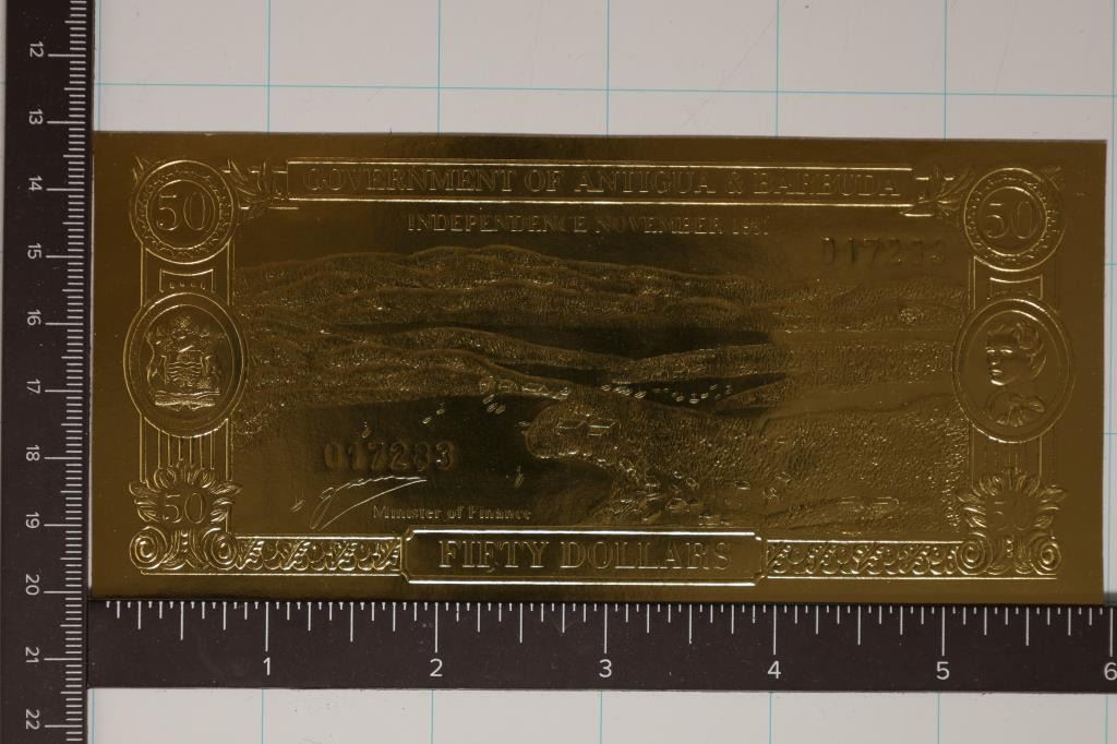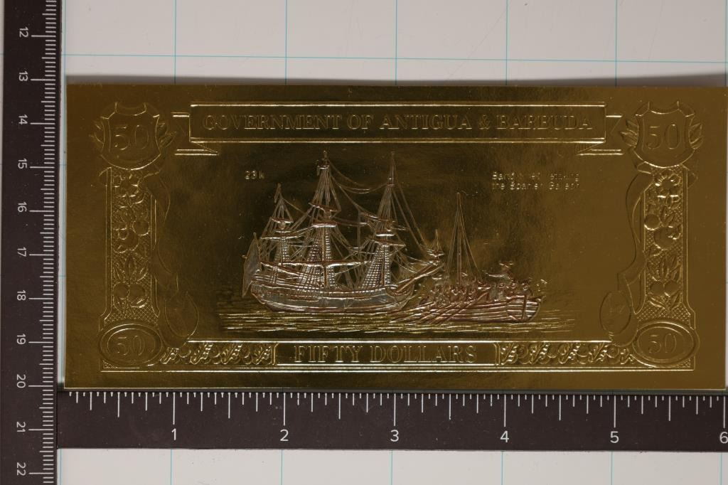 $50 CRISP UNC BILL "BARTOLOMEO RETAKING THE SPANISH GALLEON" THE SAILING SHIPS ARE COLORIZED SILVERISH