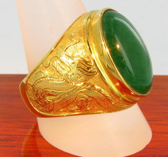 Excellent NEW hand-tooned dragon design on rich yellow 23k gold; rare translucent Burmese jade; 21.5mm