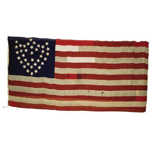 <B>23rd Army Corps Flag Made from Captured Confederate Flags in Macon, Georgia Converted into a U.S. Stars & Stripes U. S. Flag</B></I> A very unusual Civil War flag, consisting of captured Confederate flags from the arsenal in Macon, Georgia during Sherman's March to the Sea. The 35-star configuration in the form of a shield represents the 23rd Army Corps, a large regimental corps flag of wool bunting, 108” x 228.” The obverse hoist marked “H. Kitchell,” the commander of the 98th Illinois. The reverse hoist is also marked “E. Kitchell” and “EK.” Accompanied by a large file of Kitchell newspapers and documents, including the original label for the history of the flag written by Kitchell documenting that this was made from captured Confederate flags at Macon, Georgia at the end of the Civil War on April 20,1865 by the 98th Illinois Regiment.<BR><BR><B>Provenance:</B></I> <I>Crow Art Partnership Collection (Dallas, Texas)</B></I>******<BR><BR><b>Shipping:</b> Miscellaneous Collectibles, Larg (<a target="_blank" href="http://www.heritageauctions.com/common/shipping.php">view shipping information</a>)