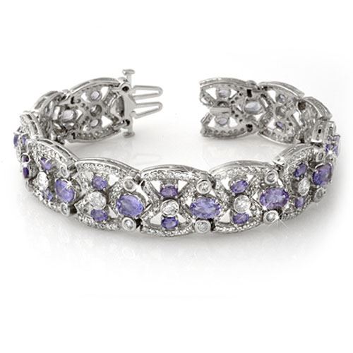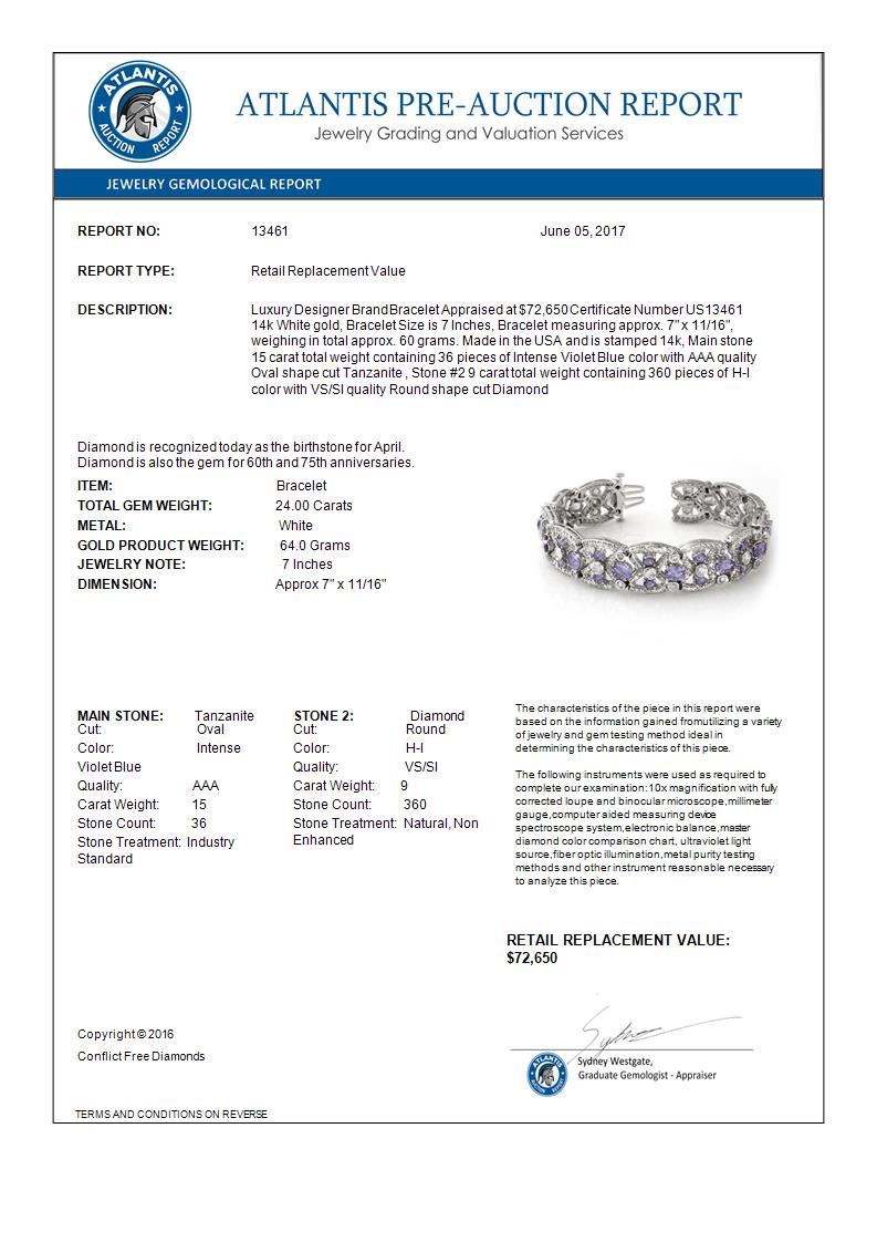 24.0 CTW Tanzanite & Diamond Bracelet 14K White Gold ---- Luxury Designer Brand Bracelet Appraised Retail Price at $72,650 ---- SKU Number US13461 14k White gold Bracelet Size is 7 Inches, Bracelet measuring approx. 7" x 11/16", weighing in total approx. 60 grams. Made in the USA and is stamped 14k, Main stone 15 carat total weight containing 36 pieces of Intense Violet Blue color with AAA quality Oval shape cut Tanzanite , Stone #2 9 carat total weight containing 360 pieces of H-I color with VS/SI quality Round shape cut