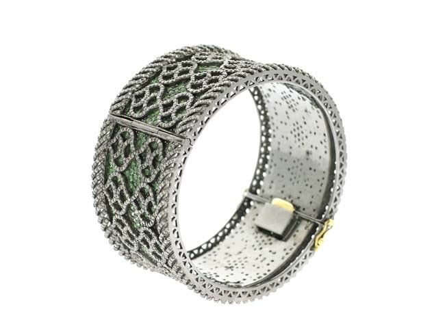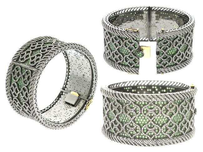 TSAVORITE AND DIAMOND CUFF BANGLE/Diamond Count 1:/Diamond Count 1 TCW:9.57/Diamond Color & Clarity:J-L/I1-I2/Diamond Count 2:/Diamond Count 2 TCW:/Diamond Color & Clarity:/Diamond Count 3:/Diamond Count 3 TCW:/Gemstone Count 1:/Gemstone Count 1 TCW:14.44/Dimension:/Metal Type:14k Gold Yellow Gold /Weight Gram:2.76over 0.925 SilverSterling Silver /Weight Gram:105.24/Gross Weight:112.81