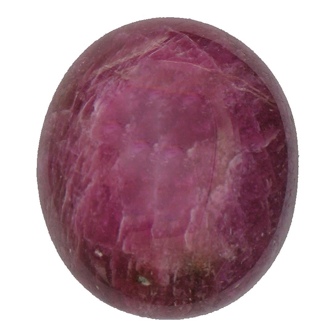 One oval cabochon cut natural ruby, measuring 16.00 x 14.00 x 9.70mm, exact weight 24.01ct., clarity is heavily included, type II, dark, very slightly brownish, slightly purplish red color, (GIA slpR 7/3), cut is good. Transmitting light diffusely, opaque. Naturally occurring internal & external characteristics are present. Indications of laboratory high temperature heat treatment, with glass & flux additives. Ruby has a low tolerance to rhodium plating, repolishing the surface, & ultrasonic cleaning. Westfield Appraised at $2,465.00.