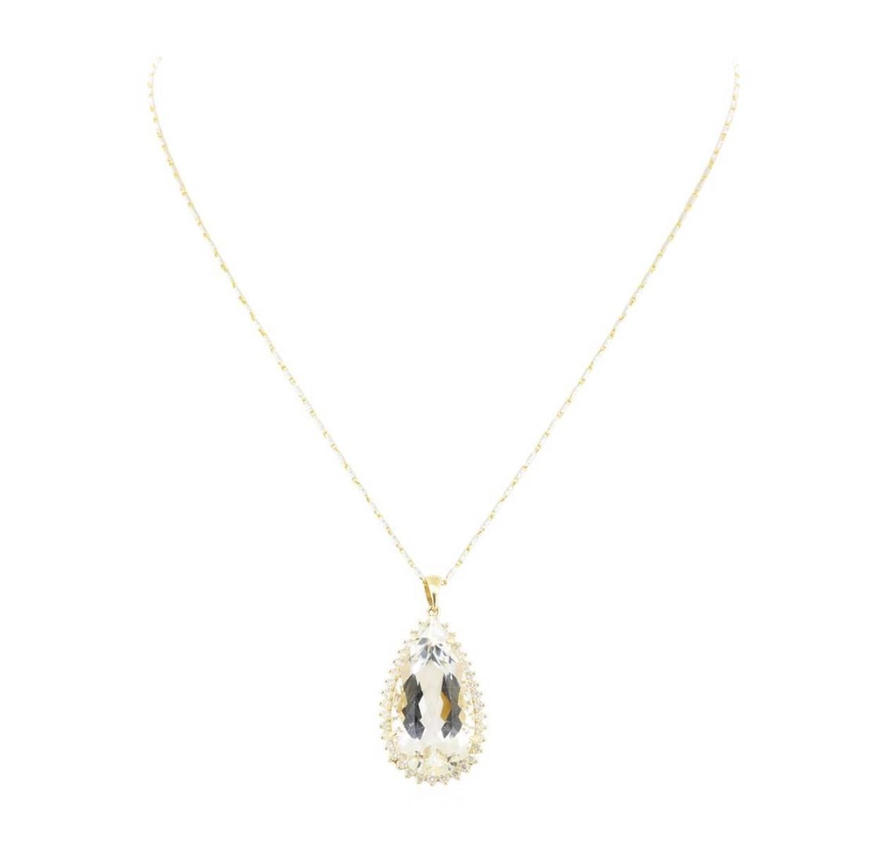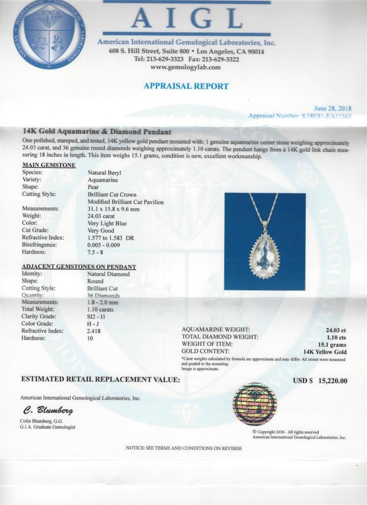 One polished, stamped, and tested, 14K yellow gold pendant mounted with: 1 genuine aquamarine center stone weighing 24.03 carat, and 36 genuine round diamonds weighing approximately 1.10 carats. The pendant hangs from a 14K gold link chain measuring 18 inches in length. This item weighs 15.1 grams, condition is new, excellent workmanship. Main gemstone- Species: Natural Beryl. Variety: Aquamarine. Shape: Pear. Cutting Style: Brilliant cut crown modified brilliant cut pavilion. Measurements: 31.1x15.8x9.6mm. Weight: 24.03 carat. Color: Very light blue. Cut Grade: Very good. Refractive Index: 1.577 to 1.583 DR. Birefringence: 0.005-0.009. Hardness: 7.5-8. Adjacent gemstones on pendant. identity: Natural Diamond. Shape: Round. Cutting Style: Brilliant Cut. Quantity: 36 diamonds. Measurements: 1.8-2.0mm. Total weight: 1.10 carats. Clarity grade: SI2-I1. Color grade H-J. Refractive Index: 2.418. Hardness 10. AQUAMARINE WEIGHT: 24.03 ct TOTAL DIAMOND WEIGHT: 1.10 cts WEIGHT OF ITEM: 15.1 grams GOLD CONTENT: 14K Yellow Gold. Estimated retail replacement value $15,220.00 US