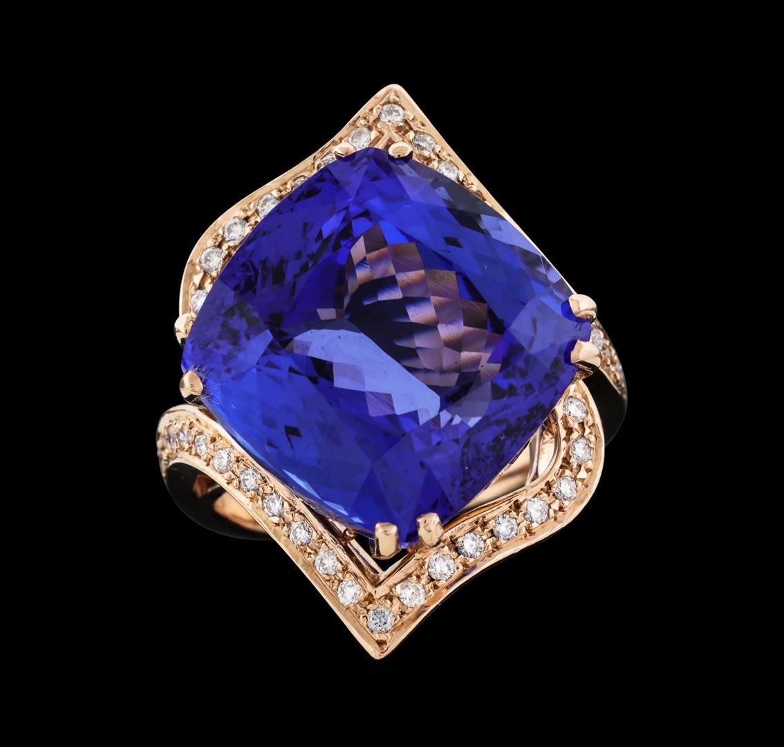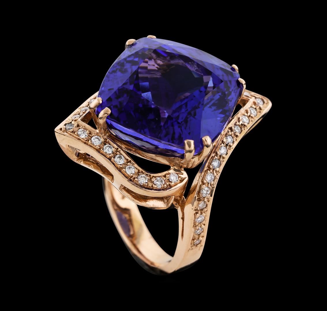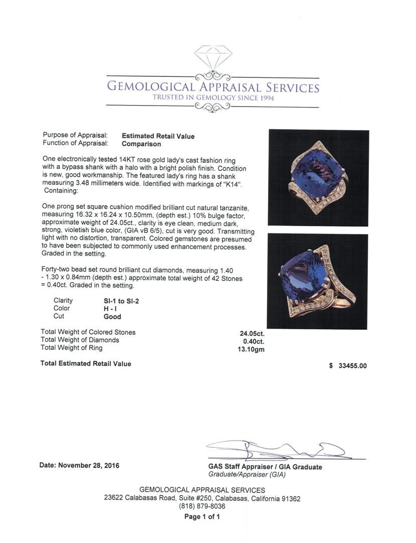 One electronically tested 14KT rose gold lady's cast fashion ring with a bypass shank with a halo with a bright polish finish. The featured lady's ring has a shank measuring 3.48 millimeters wide. Identified with markings of 'K14'. Condition is new, good workmanship. Containing: One prong set square cushion modified brilliant cut natural tanzanite, measuring 16.32 x 16.24 x 10.50mm, (depth est.) 10%. bulge factor, approximate weight of 24.05ct., clarity is eye clean, medium dark, strong, violetish blue color, (GIA vB 6/5), cut is very good. Transmitting light with no distortion, transparent. Colored gemstones are presumed to have been subjected to commonly used enhancement processes. Graded in the setting. Forty-Two bead set round brilliant cut diamonds, measuring 1.40 - 1.30 x 0.84mm (depth est.) approximate total weight of 42 Stones = 0.40ct. Graded in the setting. Clarity SI-1 to SI-2. Color: H - I Cut Good. Total Weight of Colored Stones 24.05ct.. Total Weight of Diamonds 0.40ct.. Total Weight of Ring 13.10gm. GAS Appraised at $33,455.00.