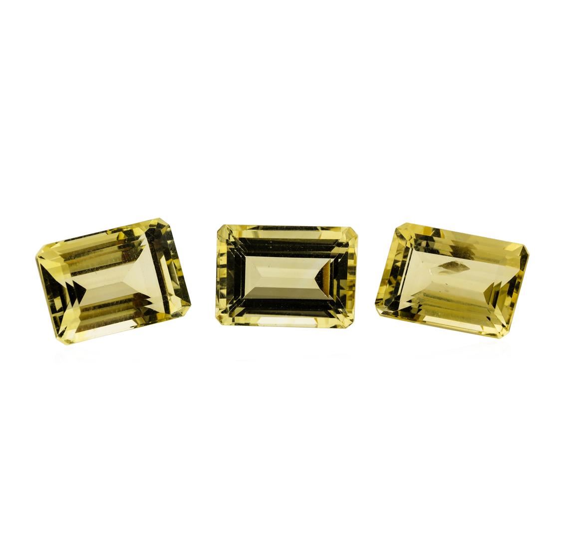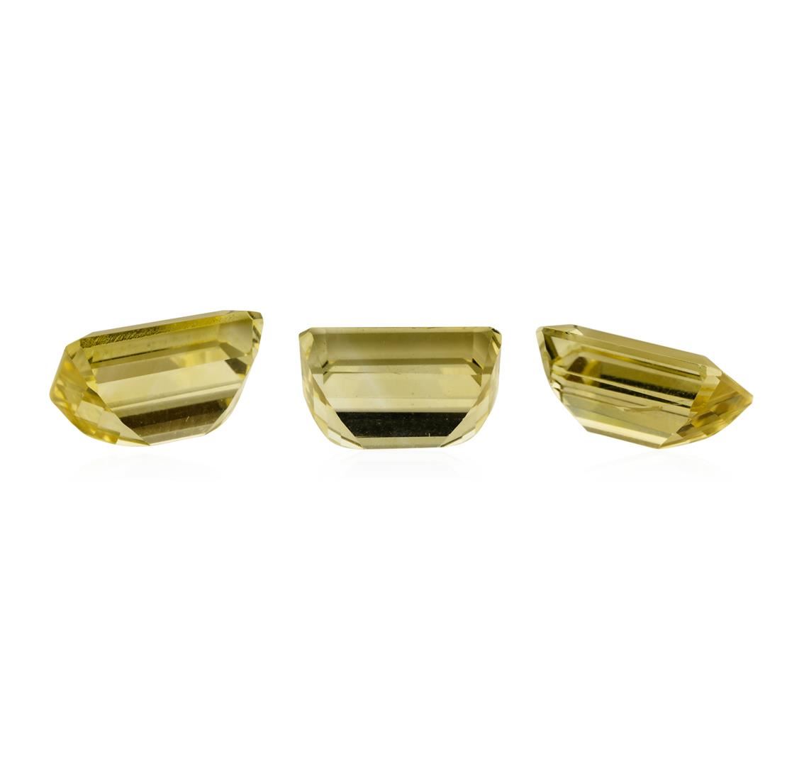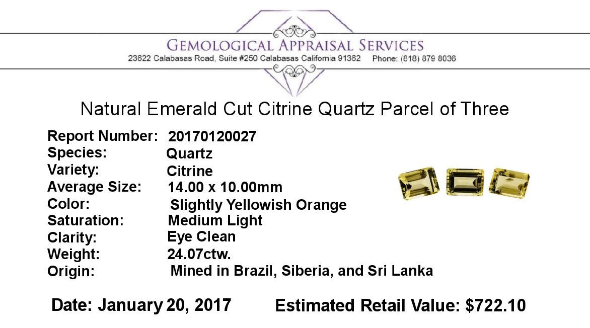 One natural emerald cut citrine quartz parcel of three with an exact weight of 24.07ctw., clarity is eye clean, slightly yellowish orange, medium light. Gemological Appraisals Services estimates the retail value at $722.1 GAS Appraised.