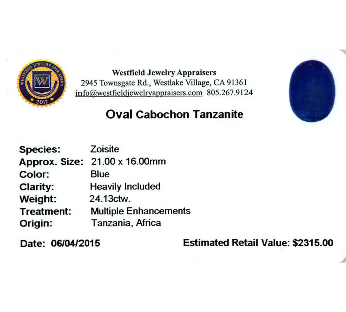One oval cabochon cut natural tanzanite, measuring 21.00 x 16.00 x 7.50mm, exact weight 24.13ct., clarity is heavily included, type I, dark, very slightly grayish, blue color, (GIA B 7/3), cut is good. Transmitting light somewhat diffusely, transparent to translucent. Naturally occurring internal & external characteristics are present. Indications of heat treatment. Westfield Appraised at $2,315.00.