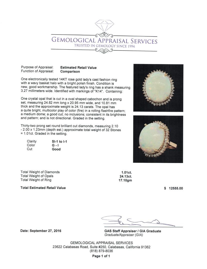 One electronically tested 14KT rose gold lady's cast fashion ring with a wavy basket halo with a bright polish finish. The featured lady's ring has a shank measuring 3.27 millimeters wide. Identified with markings of 'K14'. Condition is new, good workmanship. Containing: One crystal opal that is cut in a oval shaped cabochon and is prong set, measuring 24.82 mm long x 20.95 mm wide, and 10.81 mm thick and the approximate weight is 24.13 carats. The opal has a quite bright, multicolor play of color (fire) in a rolling flashfire pattern; a medium dome; a good cut; no inclusions; consistent in its brightness and pattern; and is not directional. Graded in the setting. Thirty-Two prong set round brilliant cut diamonds, measuring 2.10 - 2.00 x 1.23mm (depth est.) approximate total weight of 32 Stones = 1.01ct. Graded in the setting. Clarity SI-1 to I-1. Color: G - I Cut Good. Total Weight of Diamonds 1.01ct.. Total Weight of Opals 24.13ct.. Total Weight of Ring 17.10gm. GAS Appraised at $12,555.00.