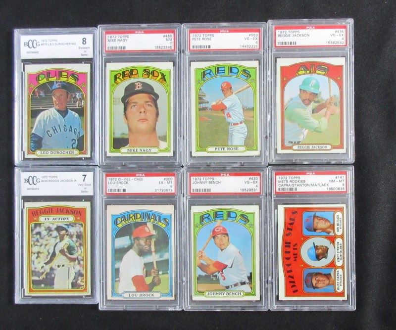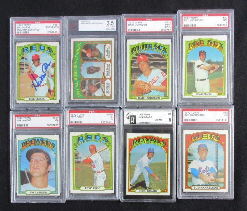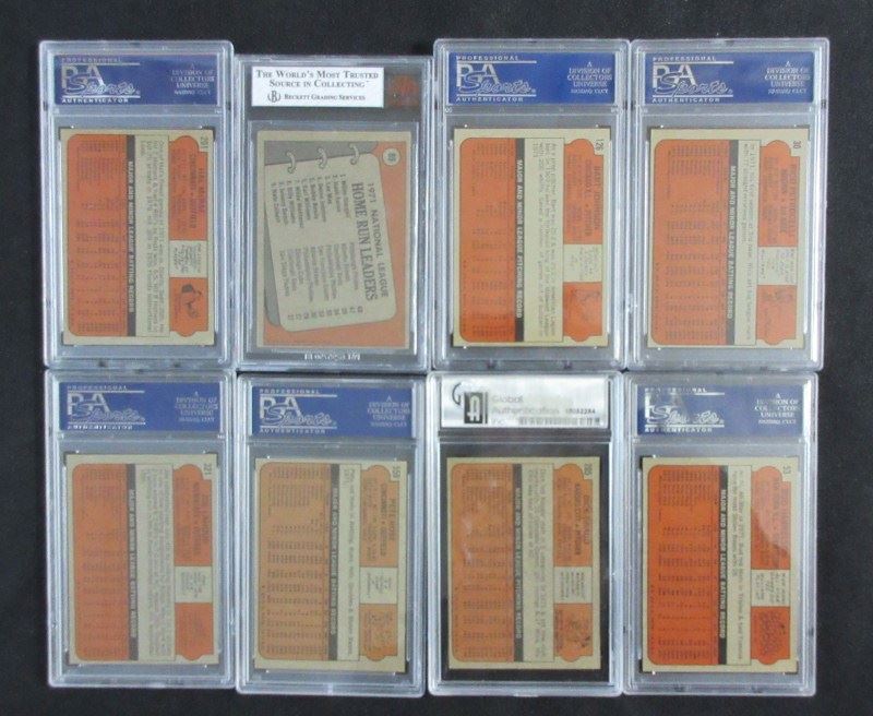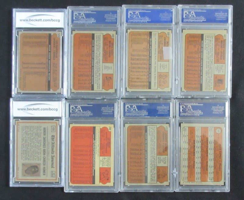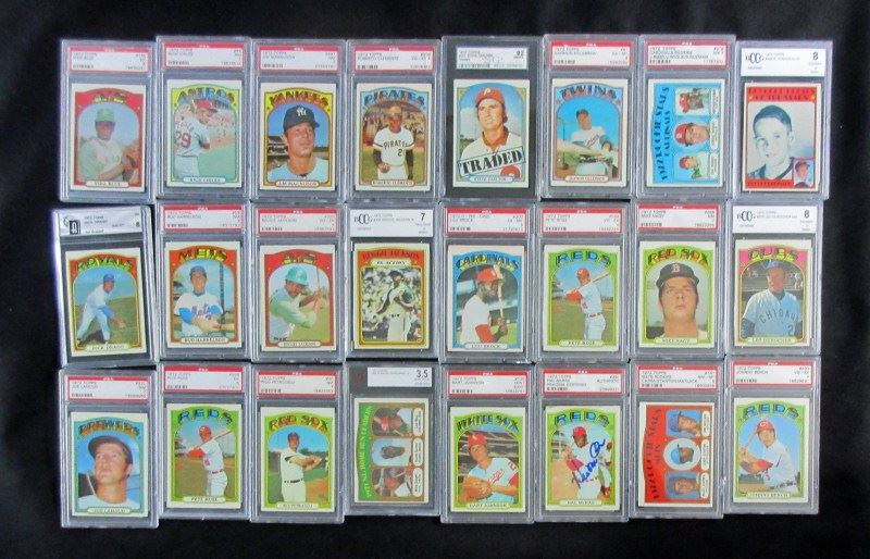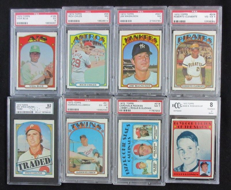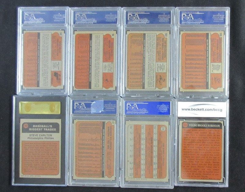 INCLUDES #51 KILLEBREW PSA 6, #309 CLEMENTE PSA 4, #433 BENCH PSA 4, #435 JACKSON PSA 4, #498 B. ROBINSON BCCG 8, 2 - #559 ROSE PSA 4&5, #751 CARLTON SGC 92 PLUS 16 OTHERS MOSTLY NM7, EST $250-$300
