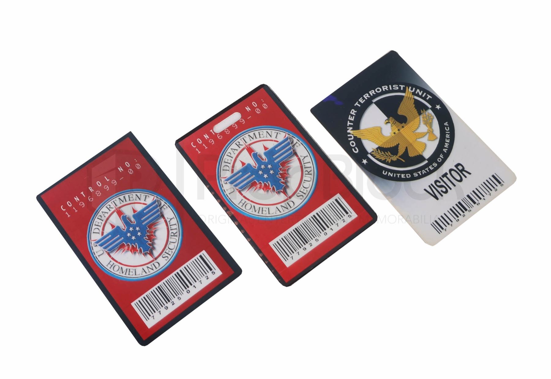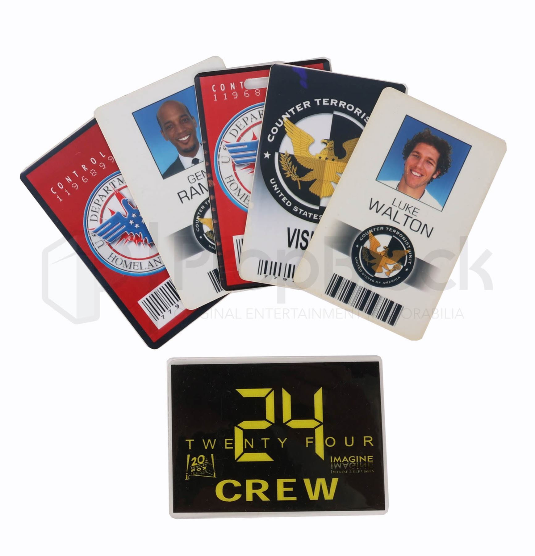 Collection of ID cards and crew pass from the long running fox thriller 24. Counterterrorism agent Jack Bauer fights the bad guys of the world, a day at a time. With each week's episode unfolding in real time, "24" covers a single day in the life of Bauer each season. Jack deals with assassination attempts, nuclear attacks, bioterrorism, torture, traitors, sleeper cells, other bad guys and the alarming tendency for his romances to end badly -- very badly. This set consists of two homeland security passes, two character specific CTU ID's and one CTU visitor pass. All ID's are printed in full color on plastic card. This lot includes one crew car pass, which cast and crew members would display in their and allow them to park on set. This set remains in excellent, production used collection.