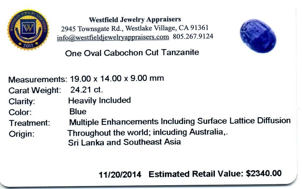 24.21ctw. One Oval Cabochon Cut Tanzanite . Westfield Appraised at $2,340.00.