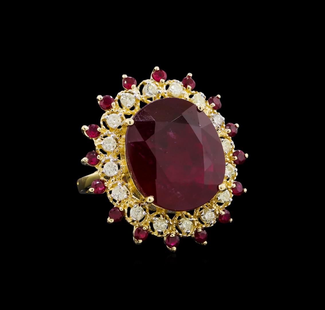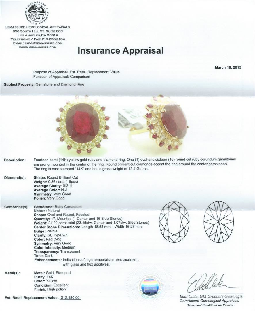 Fourteen karat (14K) yellow gold ruby and diamond ring. One (1) oval and sixteen (16) round cut ruby corundum gemstones are prong mounted in the center of the ring. Round brilliant cut diamonds accent the ring around the center gemstones. The ring is cast stamped "14K" and has a gross weight of 12.4 grams. Diamond(s): Shape: Round brilliant cut. Weight: 0.86 carat (16pcs). Average clarity: SI2-I1. Average color: H-J. Symmetry: Very good. Polish: Very Good. Gemstone(s): Gemstone: Ruby Corundum. Nature: Natural. Shape: Oval and round, faceted. Quantity: 17, mounted ( 1 center and 16 side stones). Weight: 24.22 carat total (23.15ctw. Center and 1.07ctw. Side stones). Center stone dimensions: Length-18.53 mm. ; Width-16.27 mm. Bulge: Visible. Clarity: SI, type 2/3. Color: Red (5/5). Symmetry: Very good. Color intensity: Medium. Transparency: Transparent. Tone: Dark. Enhancements: Indications of high temperature heat treatment, with glass and flux additives. Metal(s): Metal: Gold, stamped. Purity: 14K. Color: Yellow. Condition: Excellent. Finish: High polish. GGA Appraised at $12,180.00.