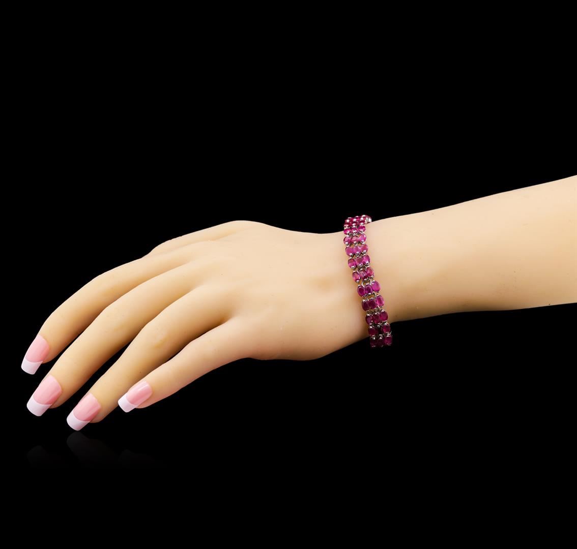 One electronically tested 925 silver lady's combination cast & assembled fashion bracelet with a tongue clasp with foldover safety with a bright polish finish. The featured lady's bracelet measures approximately 7 inches in length. Identified with markings of "925". Condition is like new, good workmanship. Containing: Ninety prong set oval modified brilliant cut natural rubies, measuring 5.05 x 3.10 x 2.02mm, approximate total weight of 24.30ct., clarity is heavily included, type II, medium light, very slightly brownish, slightly purplish red color, (GIA slpR 4/3), cut is fair. Transmitting light somewhat diffusely, transparent to translucent. Colored gemstones are presumed to have been subjected to commonly used enhancement processes. Graded in the setting.Total Weight of Colored Stones 24.30ct. Total Weight of Bracelet 19.80gm. GAS Appraised at $5,590.00.