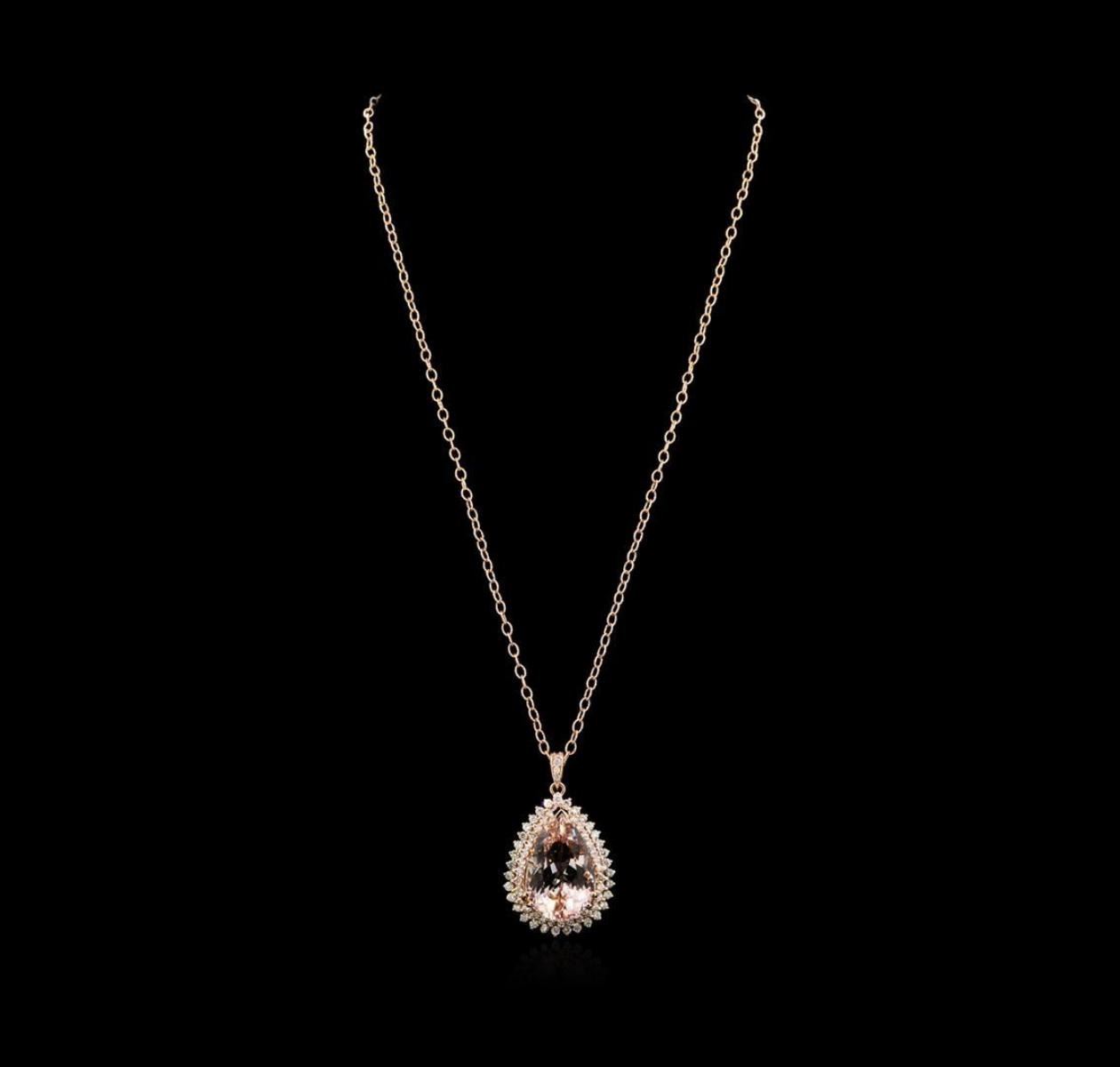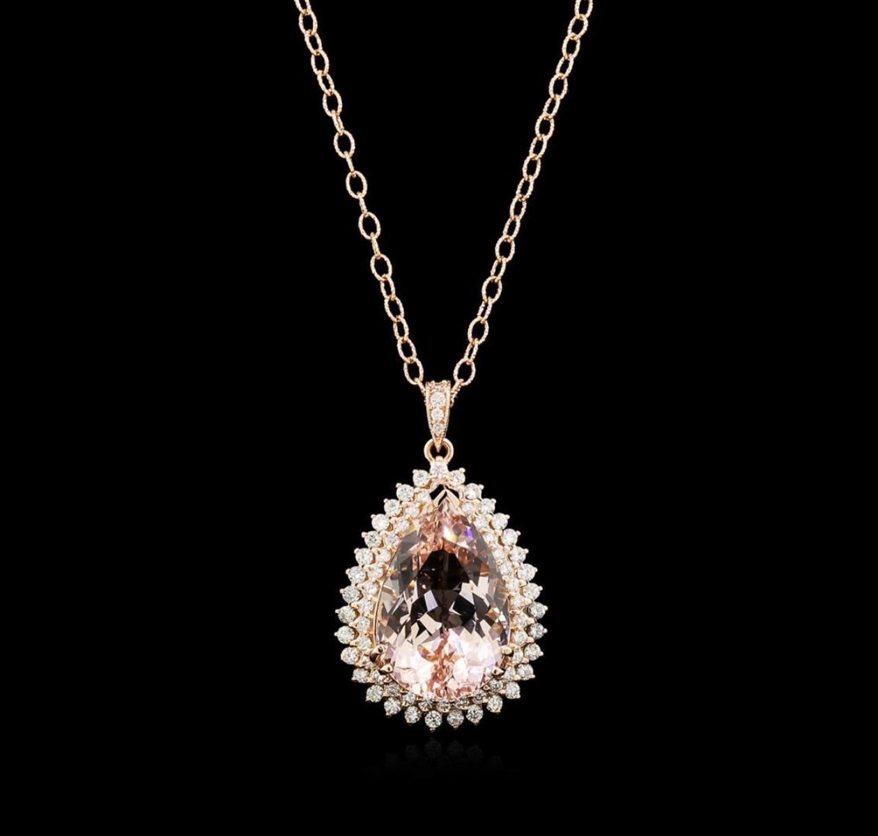 One electronically tested 14KT rose gold lady's combination cast & assembled fashion pendant & chain 18.0" long, 2.6mm oval cable link with a lobster claw clasp with a bright polish finish. Identified with markings of "14K". Condition is new, good workmanship. Containing: One prong set pear modified brilliant cut natural morganite, measuring 23.80 x 15.45 x 11.62mm, 5%. bulge factor, approximate weight of 24.32ct., clarity is eye clean, type I, red orange color, (GIA RO 0/0), cut is very good. Transmitting light with no distortion, transparent. Colored gemstones are presumed to have been subjected to commonly used enhancement processes. Graded in the setting. Thirty-Three prong set round brilliant cut diamonds, measuring 2.10 - 2.00 x 1.25mm (depth est.) approximate total weight of 33 Stones = 1.06ct. Graded in the setting. Clarity: VS-2 to SI-2. Color: H - I. Cut Very Good Thirty-Seven prong set round brilliant cut diamonds, measuring 1.90 - 1.70 x 1.13mm (depth est.) approximate total weight of 37 Stones = 0.84ct. Graded in the setting. Clarity: VS-2 to SI-2. Color: H - I. Cut Very Good. Total Weight of Colored Stones 24.32ct. Total Weight of Diamonds 1.90ct. Total Weight of Pendant & Chain 18.30gm. GAS Appraised.
