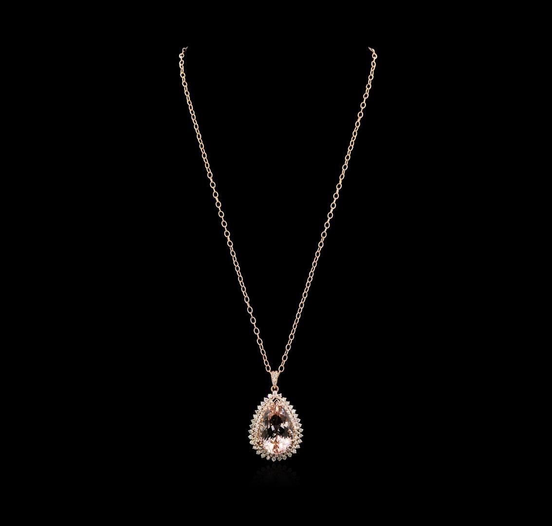 One electronically tested 14KT rose gold lady's combination cast & assembled fashion pendant & chain 18.0" long, 2.6mm oval cable link with a lobster claw clasp with a bright polish finish. Identified with markings of "14K". Condition is new, good workmanship. Containing: One prong set pear modified brilliant cut natural morganite, measuring 23.80 x 15.45 x 11.62mm, 5%. bulge factor, approximate weight of 24.32ct., clarity is eye clean, type I, red orange color, (GIA RO 0/0), cut is very good. Transmitting light with no distortion, transparent. Colored gemstones are presumed to have been subjected to commonly used enhancement processes. Graded in the setting. Thirty-Three prong set round brilliant cut diamonds, measuring 2.10 - 2.00 x 1.25mm (depth est.) approximate total weight of 33 Stones = 1.06ct. Graded in the setting. Clarity: VS-2 to SI-2. Color: H - I. Cut Very Good Thirty-Seven prong set round brilliant cut diamonds, measuring 1.90 - 1.70 x 1.13mm (depth est.) approximate total weight of 37 Stones = 0.84ct. Graded in the setting. Clarity: VS-2 to SI-2. Color: H - I. Cut Very Good. Total Weight of Colored Stones 24.32ct. Total Weight of Diamonds 1.90 ct. Total Weight of Pendant & Chain 18.30gm. GAS Appraised.