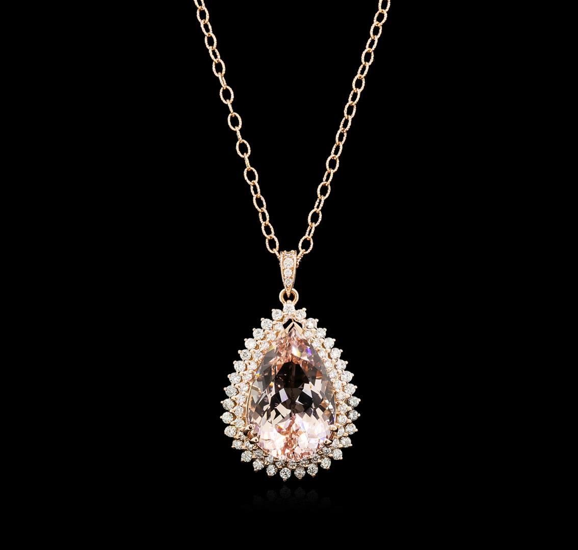 One electronically tested 14KT rose gold lady's combination cast & assembled fashion pendant & chain 18.0" long, 2.6mm oval cable link with a lobster claw clasp with a bright polish finish. Identified with markings of "14K". Condition is new, good workmanship. Containing: One prong set pear modified brilliant cut natural morganite, measuring 23.80 x 15.45 x 11.62mm, 5%. bulge factor, approximate weight of 24.32ct., clarity is eye clean, type I, red orange color, (GIA RO 0/0), cut is very good. Transmitting light with no distortion, transparent. Colored gemstones are presumed to have been subjected to commonly used enhancement processes. Graded in the setting. Thirty-Three prong set round brilliant cut diamonds, measuring 2.10 - 2.00 x 1.25mm (depth est.) approximate total weight of 33 Stones = 1.06ct. Graded in the setting. Clarity: VS-2 to SI-2. Color: H - I. Cut Very Good Thirty-Seven prong set round brilliant cut diamonds, measuring 1.90 - 1.70 x 1.13mm (depth est.) approximate total weight of 37 Stones = 0.84ct. Graded in the setting. Clarity: VS-2 to SI-2. Color: H - I. Cut Very Good. Total Weight of Colored Stones 24.32ct. Total Weight of Diamonds 1.90 ct. Total Weight of Pendant & Chain 18.30gm. GAS Appraised.