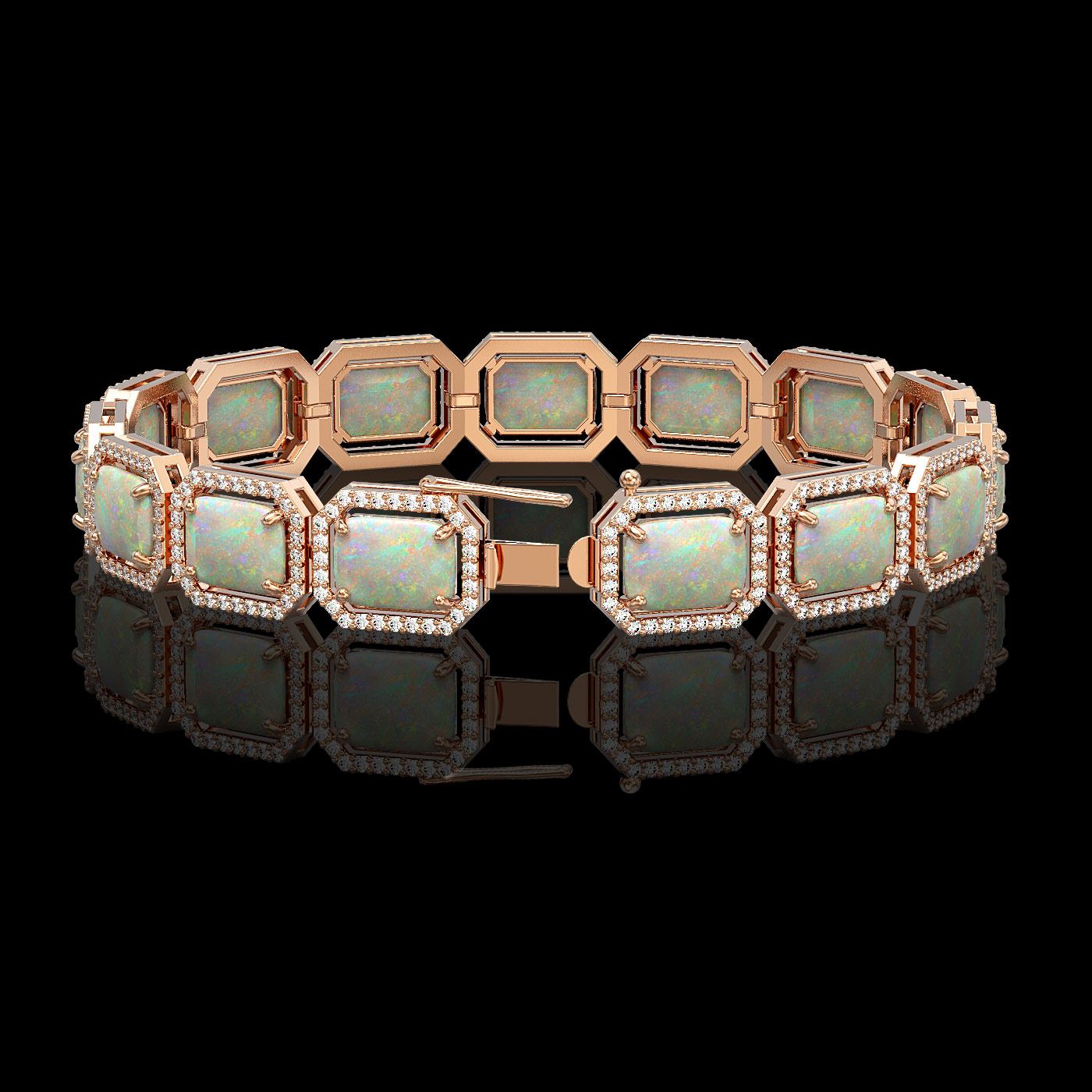 REF-372W8F -41538 ---- 24.37 CTW Opal & Diamond Halo Bracelet 10K Rose Gold ---- Luxury Designer Brand Bracelet Appraised at $20,500 Certificate Number US41538  10k Rose gold,  Bracelet Size is 7 Inches, Bracelet measuring approx. 10 mm x 7 Inches, weighing in total approx. 16 grams. Made in the USA and is stamped 10k, Main stone 21.01 carat total weight containing 15 pieces of White with Fire color with AAA quality Emerald Cut shape cut Opal , Stone #2 3.36 carat total weight containing 420 pieces of G-H color with  VS/SI quality Round shape cut Diamond