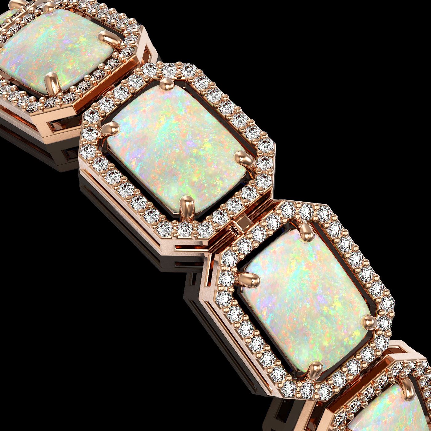 REF-372W8F -41538 ---- 24.37 CTW Opal & Diamond Halo Bracelet 10K Rose Gold ---- Luxury Designer Brand Bracelet Appraised at $20,500 Certificate Number US41538 10k Rose gold, Bracelet Size is 7 Inches, Bracelet measuring approx. 10 mm x 7 Inches, weighing in total approx. 16 grams. Made in the USA and is stamped 10k, Main stone 21.01 carat total weight containing 15 pieces of White with Fire color with AAA quality Emerald Cut shape cut Opal , Stone #2 3.36 carat total weight containing 420 pieces of G-H color with VS/SI quality Round shape cut Diamond