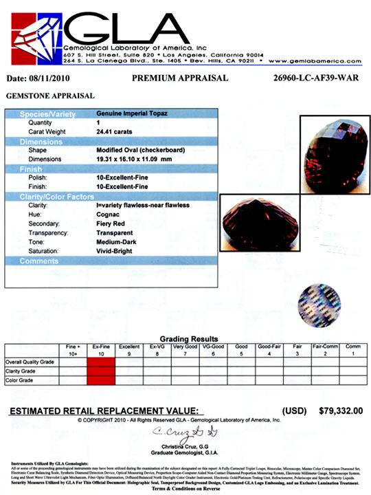 Excellent cognac red colored specimen oval cut; lab quality evaluation 10; treatment as noted; Gem Guide wholesale $12205-$18308; full retail appraisal $79332; full lab evaluation included