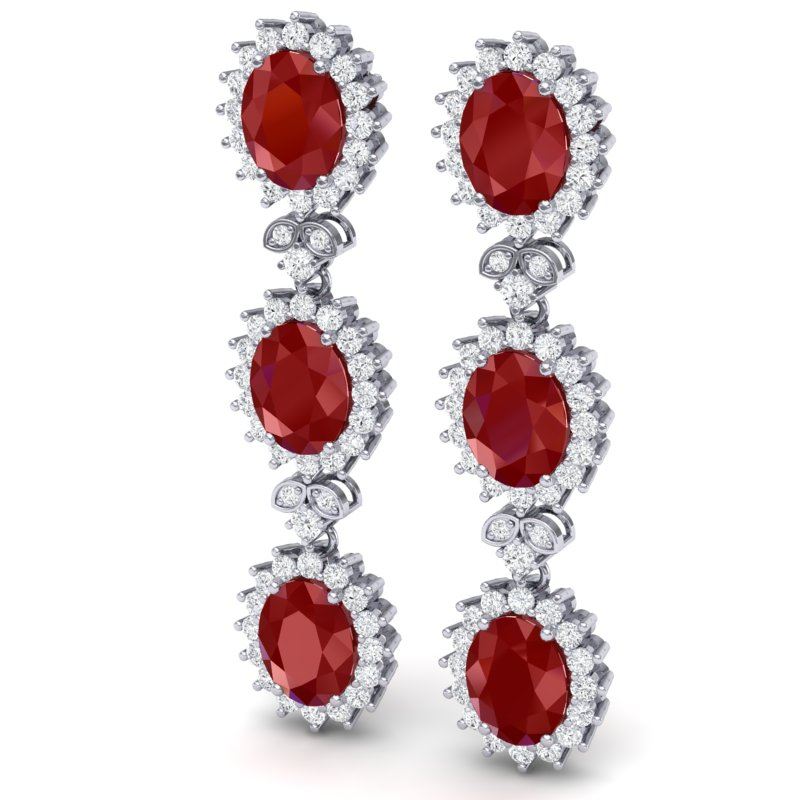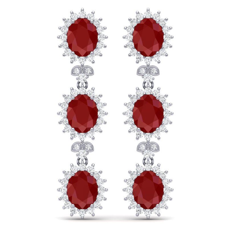24.52 CTW Royalty Designer Ruby & VS Diamond Earrings 18K White Gold ---- Luxury Designer Brand Earring Appraised Retail Price at $36,000 ---- SKU Number US38640 18K White gold Earring Size is 55 Millimeter long, Earring measuring approx. 2 1/2 x 1/2 Inches, weighing in total approx. 15 grams. Made in the USA and is stamped 18K, Main stone 20.46 carat total weight containing 6 pieces of Intense Mid-Opaque Red color with AAA quality Oval shape cut Ruby , Stone #2 4.06 carat total weight containing 108 pieces of G-H color with VS/SI quality Round shape cut