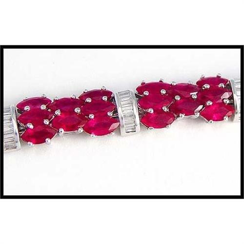 Blood red, excellent natural rubies that total 24.55 carats, and 89 bright baguette diamonds (1.70 carats) are combined in the 18K solid white gold (34.1 grams) bracelet. It measures 8 inches long. We have the ability to change the length if needed. It is 10mm (3/8") wide. Many rubies of this fine color lack the brilliance (sparkle) of these gems. Important bracelets such as this are never seen for less than its original price of $10,000. Here we have a great buyer opportunity for you to own it for a fraction of that amount. Very well made, and in extra fine condition. Perfect to be worn on the red carpet at the Academy Awards.<p>Note: Free shipping for this item, we cover for you.